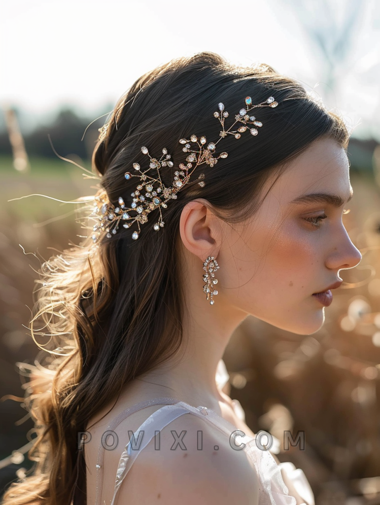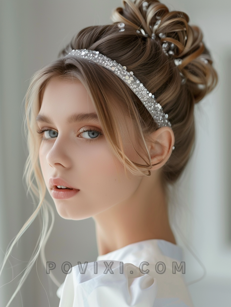 This hairstyle is a classic that pairs beautifully with long or medium length hair, making it ideal for elegant evenings or weddings. The embellished headband adds a sophisticated sparkle that draws attention.