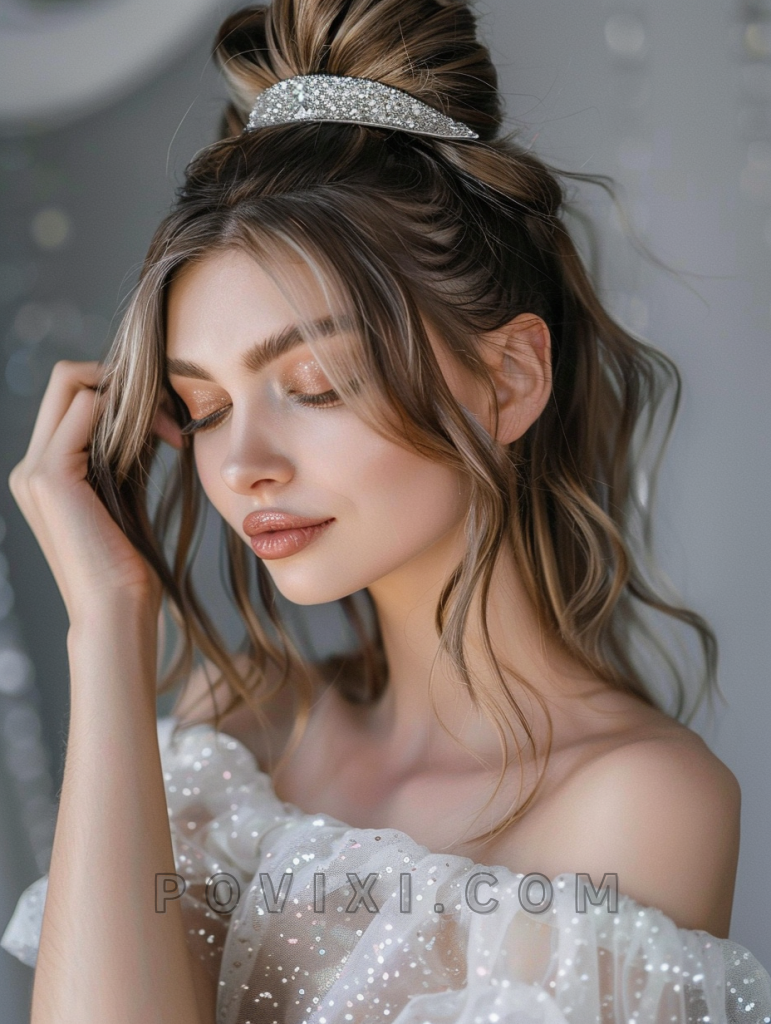 The half-bun is a trendy choice that suits long or medium hair, perfect for both day and night settings. Adding a sparkly headband brings a bit of glamour to an otherwise simple style.