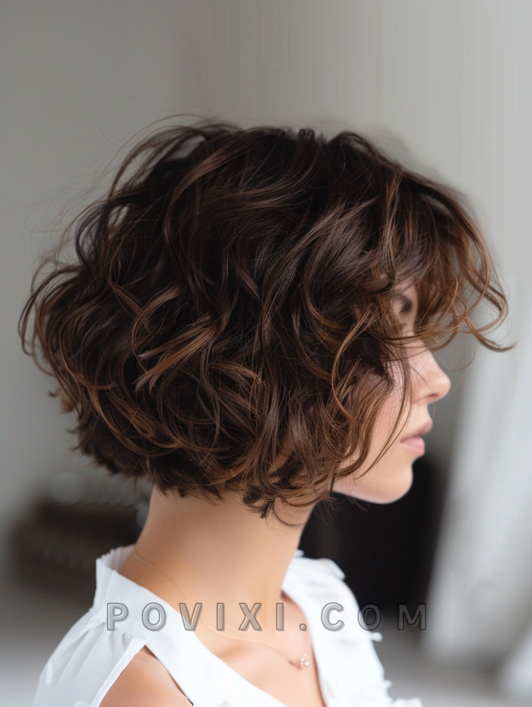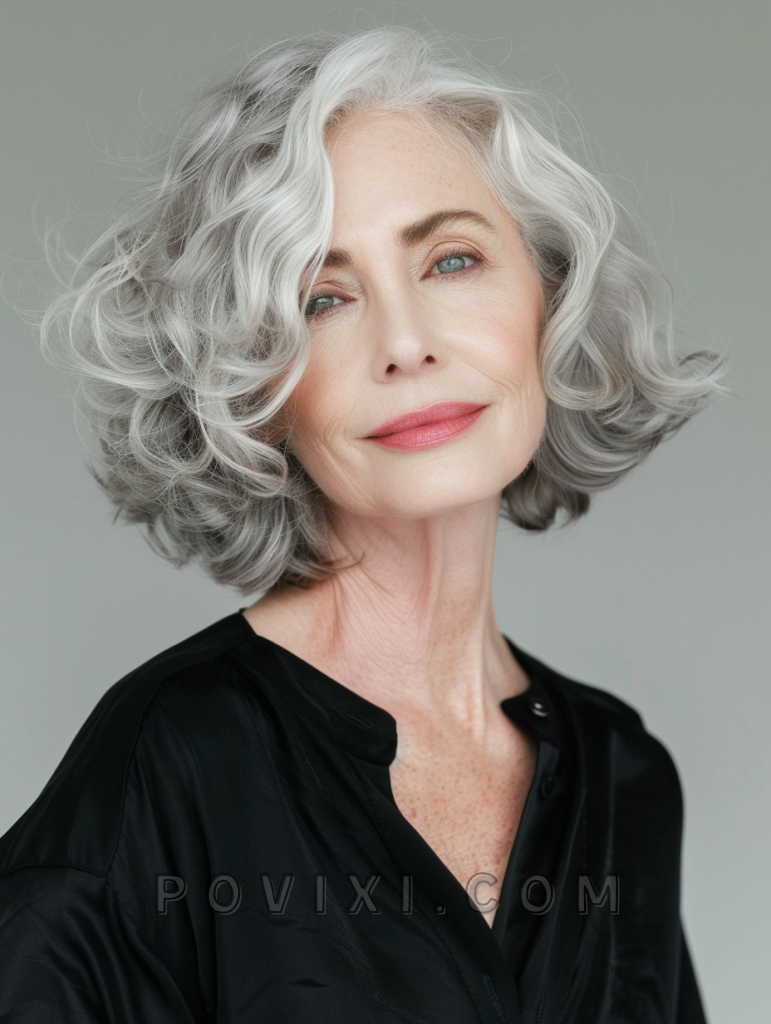 This version of the bob features stacked layers at the back, creating a voluminous, rounded look that adds depth to the curls. It’s an excellent style for women over 50 looking to add volume and movement to their hair, providing a youthful yet sophisticated appearance.