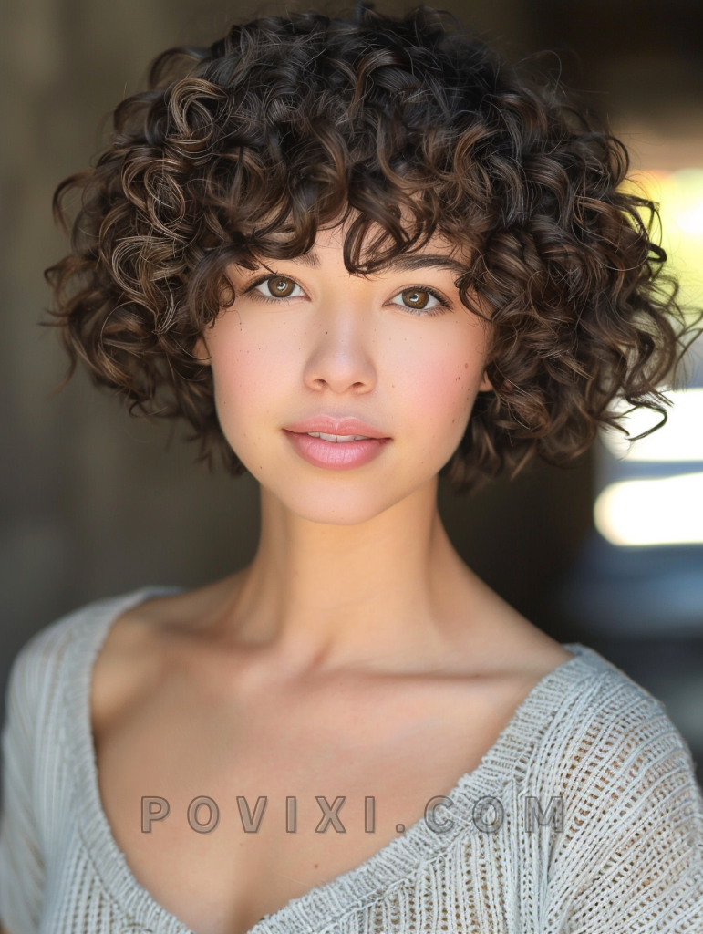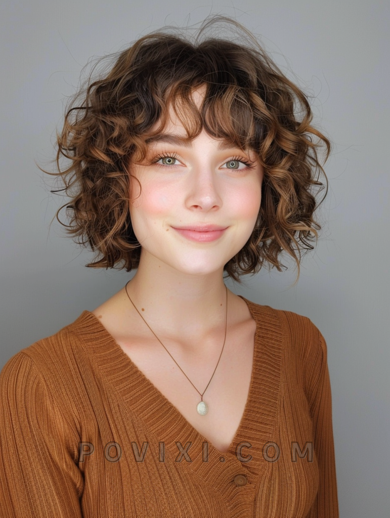 Add a touch of whimsy to your look with textured curls complemented by mini bangs. This style is playful and chic, perfect for those who enjoy a youthful look that stands out. It works well for all face shapes and is easy to style for any occasion.