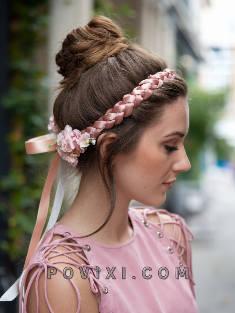 The braided ribbon crown is an elegant and aesthetic style perfect for weddings or formal events. This hairstyle weaves soft, satin ribbons through your hair in a braid style that wraps around the head, creating a halo effect. It’s a great choice for curly hair or long hair and flatters those with oval or heart-shaped faces. Soft pastel ribbons can enhance blue or green eyes, while metallic ribbons add sparkle for evening events.