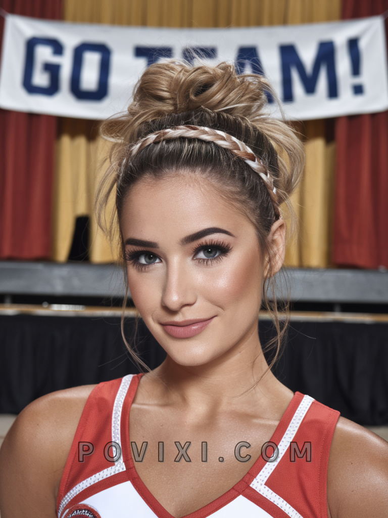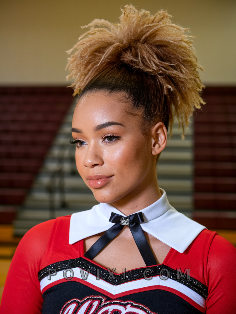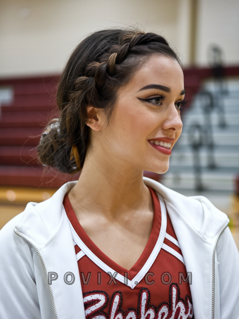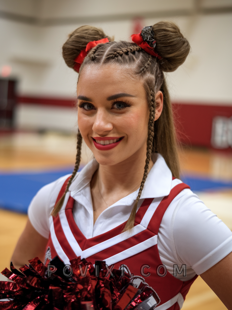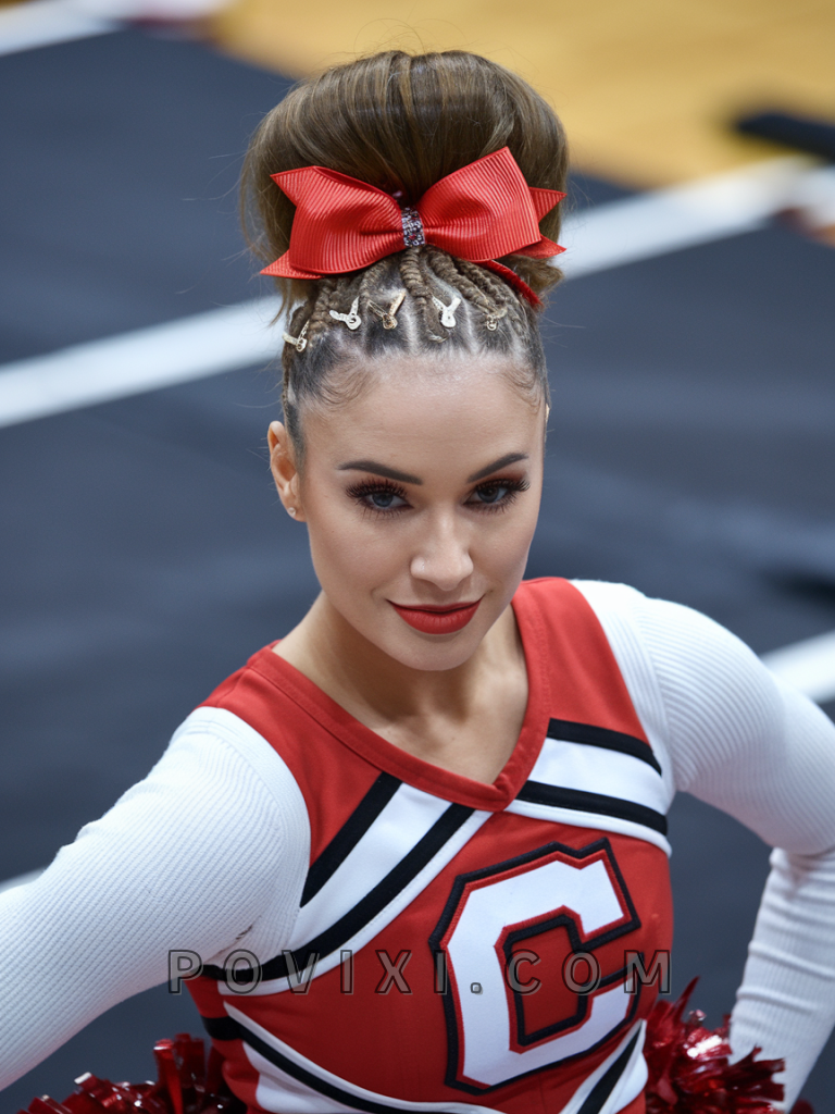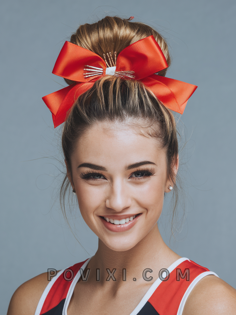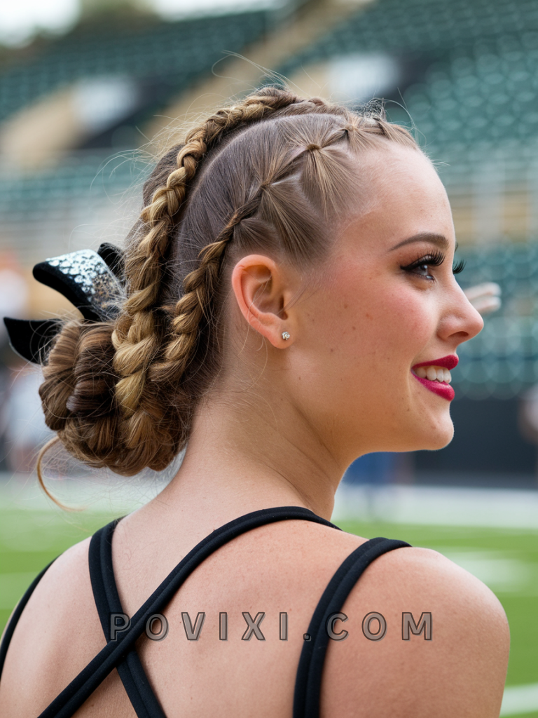 The high bun with bows is a polished and classic cheerleader look that’s both stylish and functional. Perfect for short hair or longer locks, this hairstyle keeps hair off the face while showcasing a team-colored bow. It suits heart and oval-shaped faces, accentuating the jawline and neck.