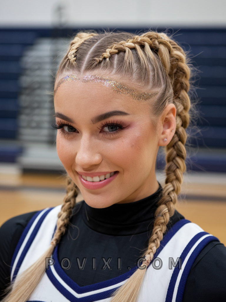 For a bold, spirited look, try double French braids accented with glitter. This hairstyle is ideal for school pep rallies and team photos, giving an extra touch of sparkle. The symmetrical braids suit all face shapes, adding structure and definition.