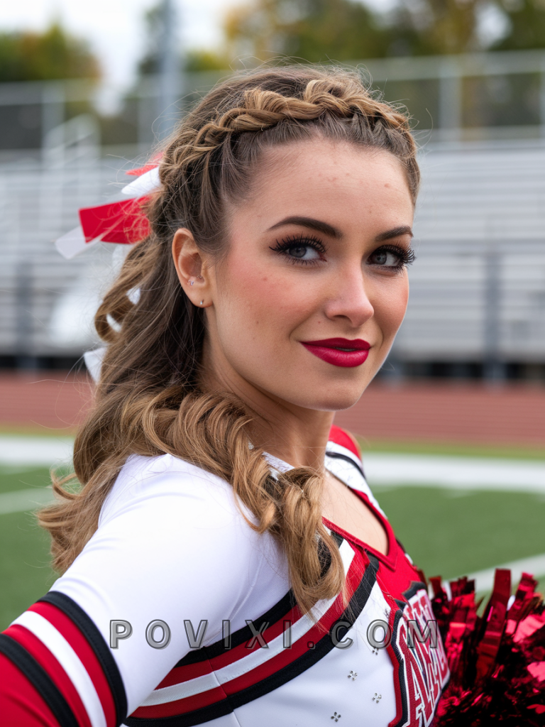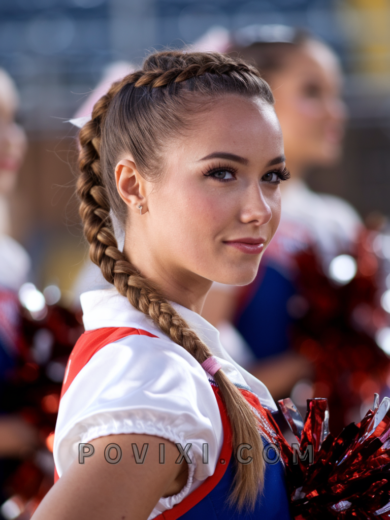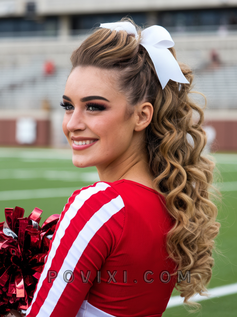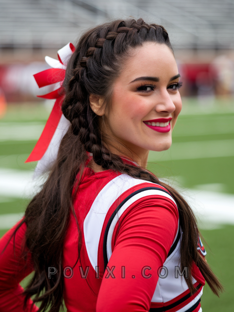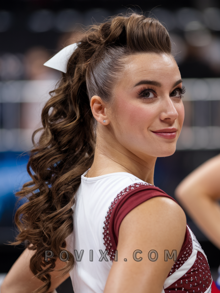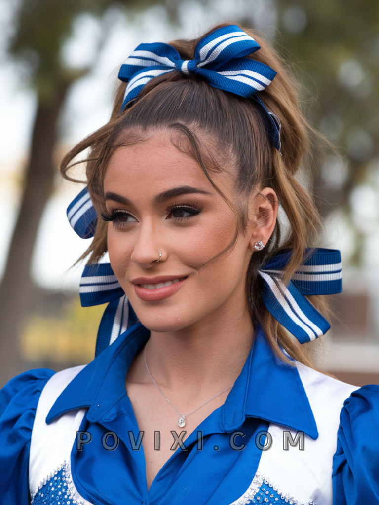 The high ponytail with bows is a classic cheerleader hairstyle that screams spirit and energy. This style features a sleek or slightly textured ponytail secured at the crown of the head and accented with a bold, colorful bow. It’s perfect for sideline performances, school pep rallies, or even high-energy competitions. Best suited for oval or heart-shaped faces, the high ponytail elongates the neck, giving a graceful appearance. Bright bows can complement eye colors such as blue or green, making them pop against the uniform.