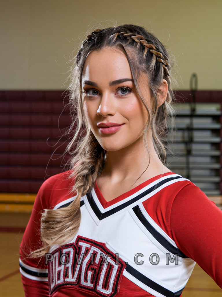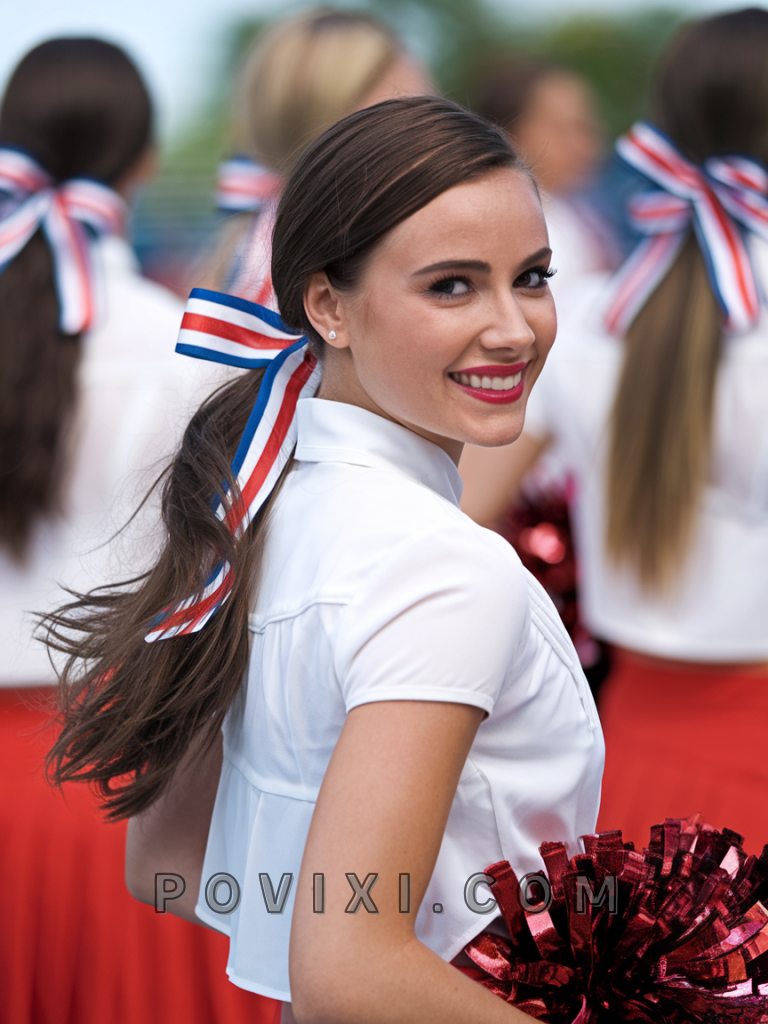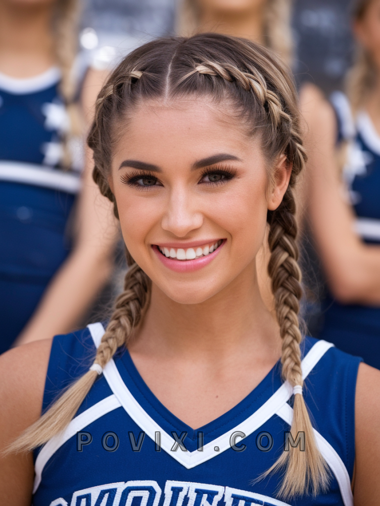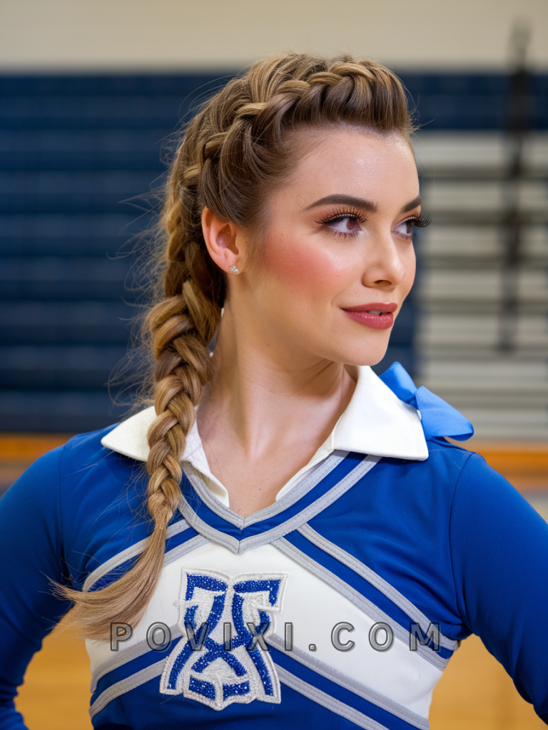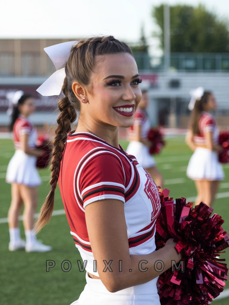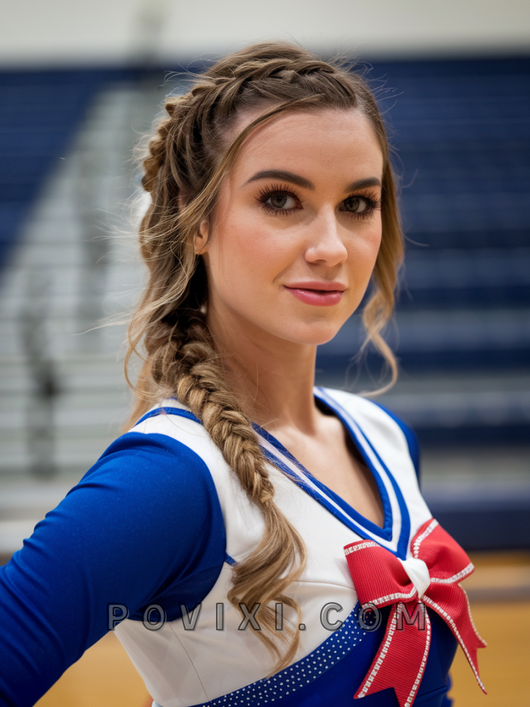 The high ponytail with bows is a classic cheerleader hairstyle that screams spirit and energy. This style features a sleek or slightly textured ponytail secured at the crown of the head and accented with a bold, colorful bow. It’s perfect for sideline performances, school pep rallies, or even high-energy competitions. Best suited for oval or heart-shaped faces, the high ponytail elongates the neck, giving a graceful appearance. Bright bows can complement eye colors such as blue or green, making them pop against the uniform.