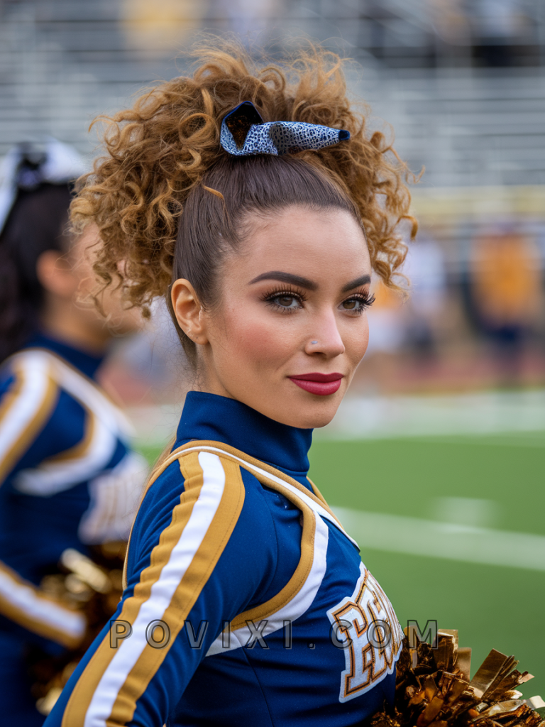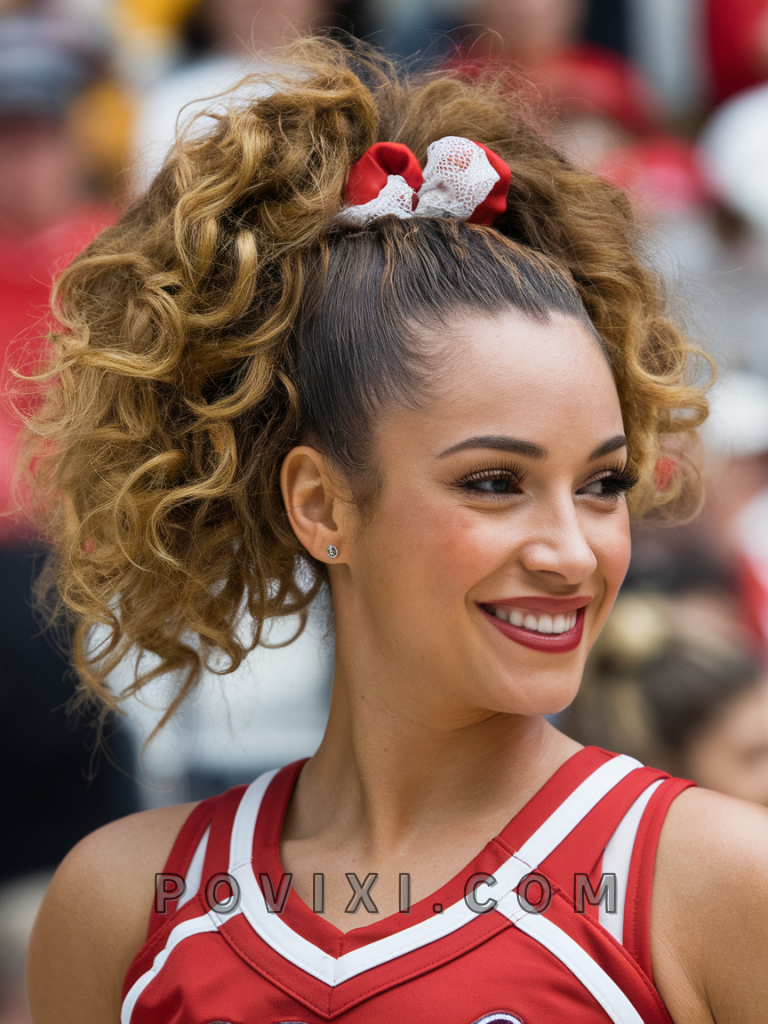 A curly high ponytail secured with a scrunchie is a retro-inspired look that’s trending in 2025. This style is perfect for curly hair, adding volume and bounce that’s ideal for sideline performances. It’s especially flattering for oval and heart-shaped faces, emphasizing the cheekbones and eyes.