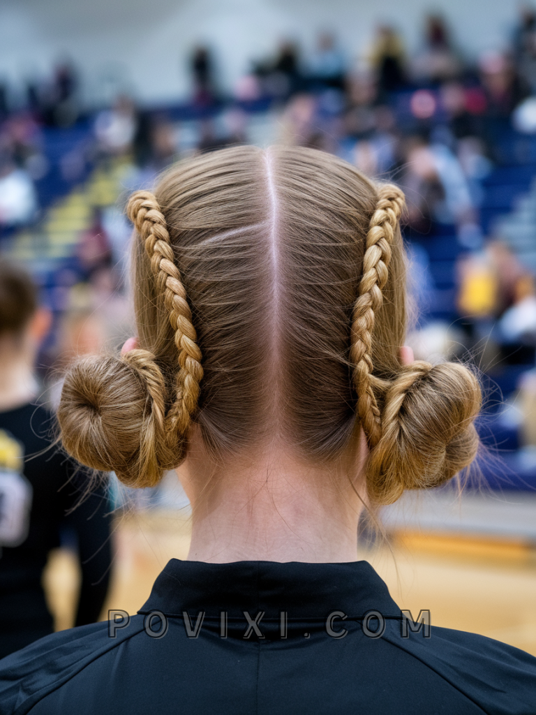 Space buns with braids combine fun and functionality, making them a perfect hairstyle for high school cheer events.