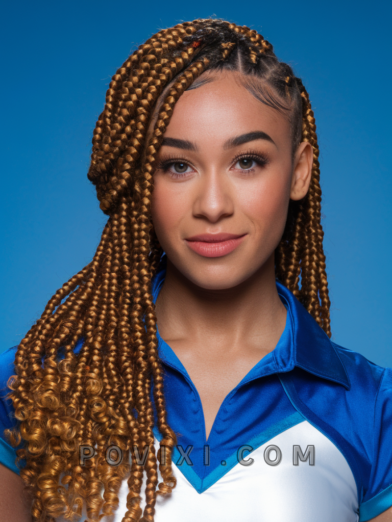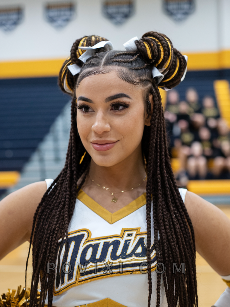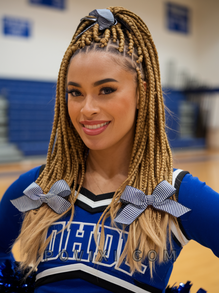 Box braids with bows combine cultural heritage with cheer spirit, offering a protective yet stylish look. Perfect for black women, this hairstyle is ideal for school pep rallies or sideline performances. The braids are versatile, working for all face shapes and easily customized with colorful bows matching the team’s colors.