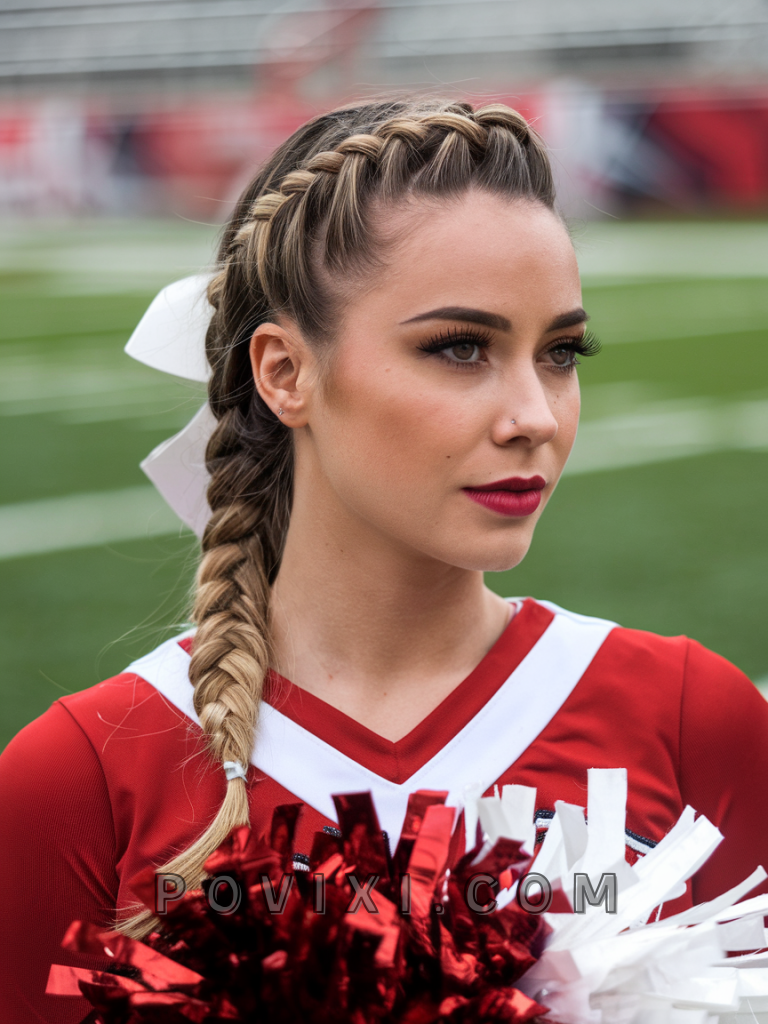 A side braid tied with a ribbon is a whimsical and cute choice for cheerleaders. The braid cascades over one shoulder, making it perfect for performances and photo ops.