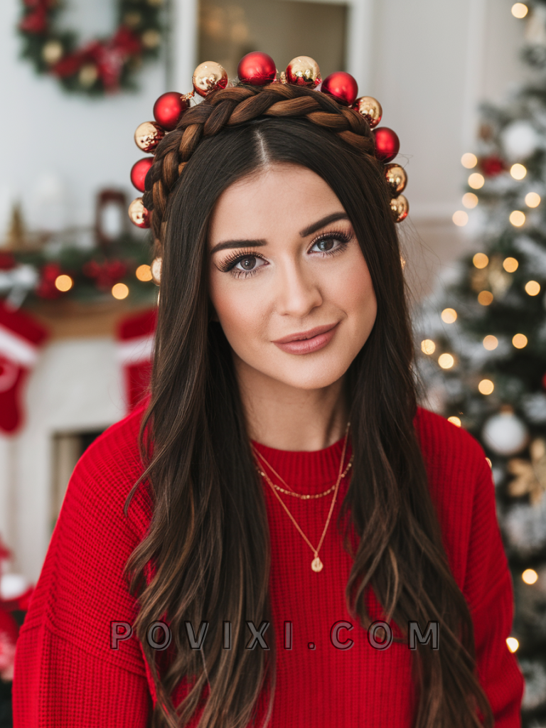 To create this hairstyle, you’ll need a rat-tail comb, some bobby pins, and a good texturizing spray. Start by parting your hair in the middle, then French braid each side before wrapping the braids across the top of your head. Secure with pins and finish with a firm-hold hairspray for a lasting look. For added sparkle, weave in some festive hair accessories like mini ornaments or ribbons.