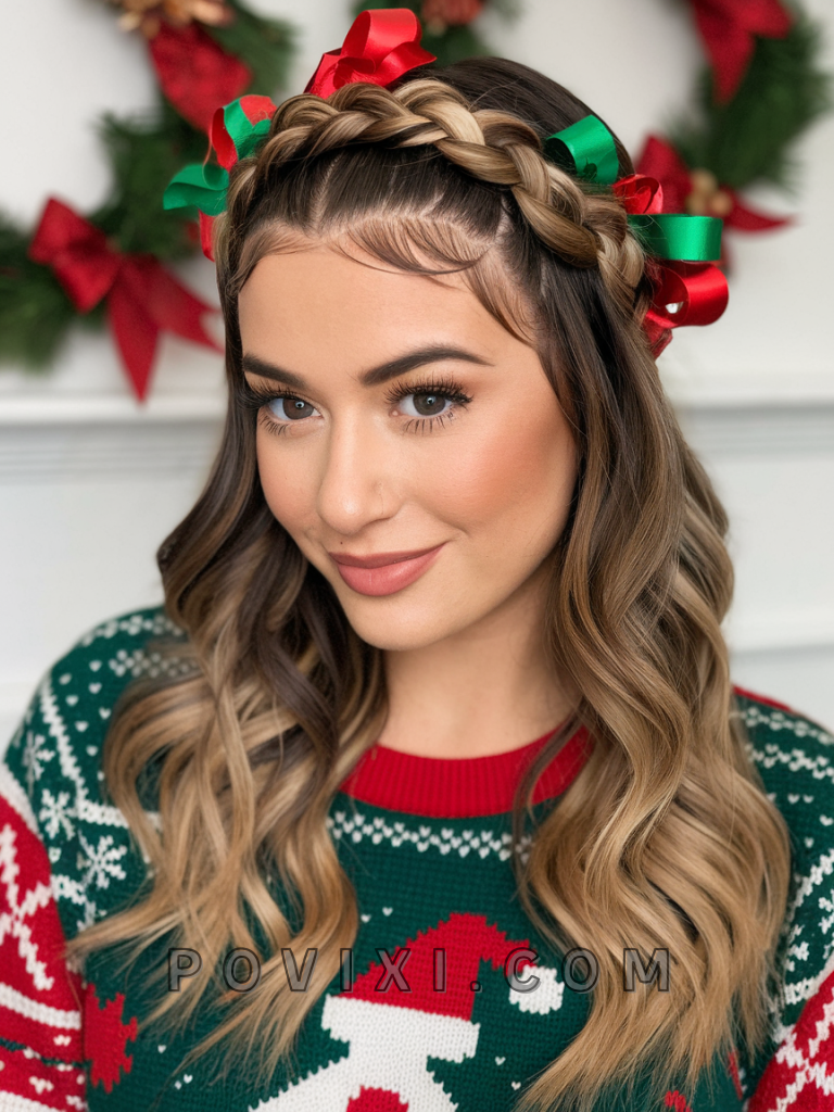 For a laid-back, boho-chic vibe, the long loose waves with a braided headband is a simple yet elegant option. Perfect for casual holiday parties or family gatherings, this style suits all face shapes and adds a youthful touch to your Christmas look. It’s particularly flattering on women with hazel or light brown eyes, making the braid pop.