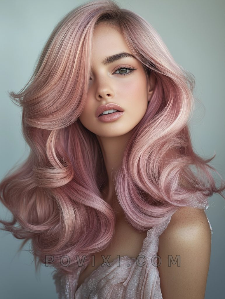 The combination of dusty pink and silver highlights creates a chic and sophisticated look. The soft pink is elevated by the cool-toned silver, making this style perfect for elegant occasions, such as weddings or upscale events. This style flatters oval and heart-shaped faces and complements blue or grey eyes.