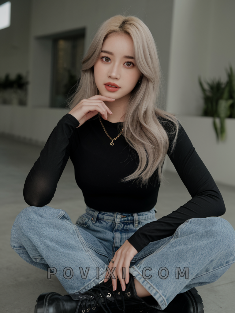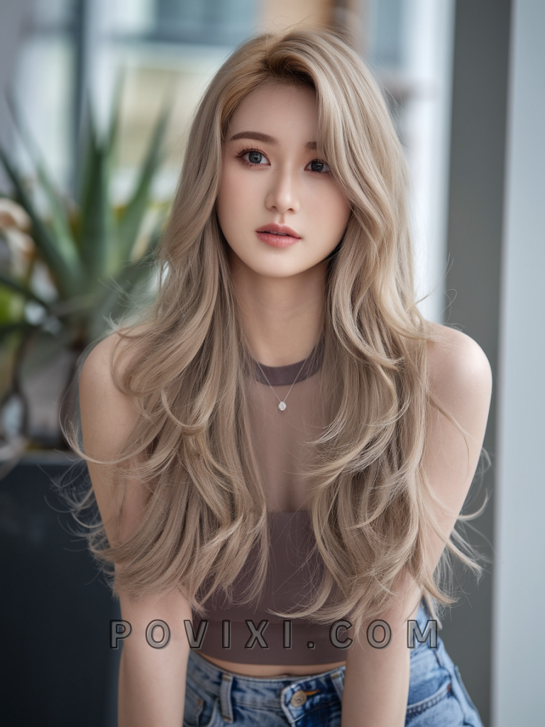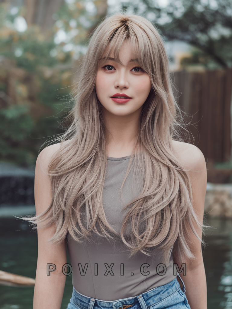 The Korean ash blonde trend is a sleek, modern choice for Asian hair types. This ashy tone cools down natural warmth, offering a minimalist and chic vibe.  It’s perfect for urban outings, work events, or winter gatherings, enhancing fair skin and light brown eyes.