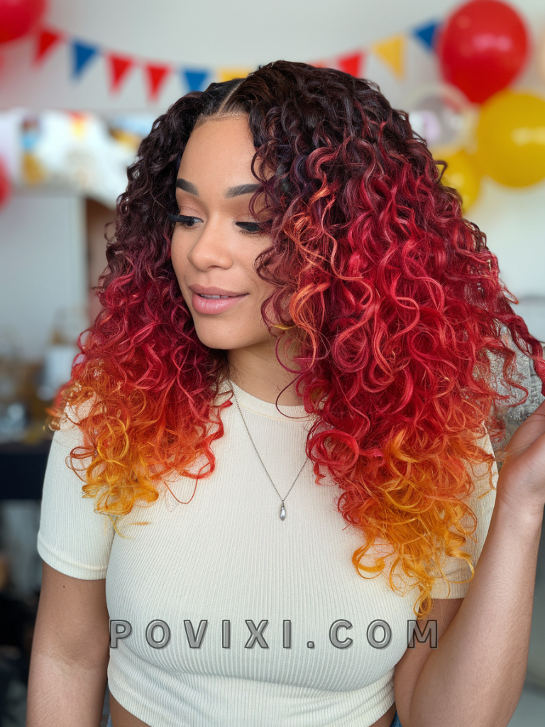 The sunset ombre trend blends fiery red, orange, and yellow tones for a vibrant gradient effect, ideal for curly hair. This dynamic style is perfect for summer vacations, music festivals, or creative photo shoots. It flatters warm undertones and enhances the texture of curls.