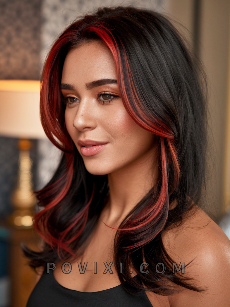 Red highlights are a timeless way to add depth and dimension to black hair. This style is perfect for those wanting a subtle transformation without a full-color commitment. It’s ideal for winter holidays or romantic evenings and works well for darker skin tones with warm undertones.