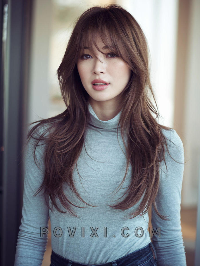 To style this look, start by blow-drying your hair using a round brush to add volume to the layers and bangs. A flat iron helps smooth out the layers, while a light hairspray keeps everything in place. Regular trims will keep the layers sharp, and using a shine-enhancing serum will maintain the healthy glow of your long hair.