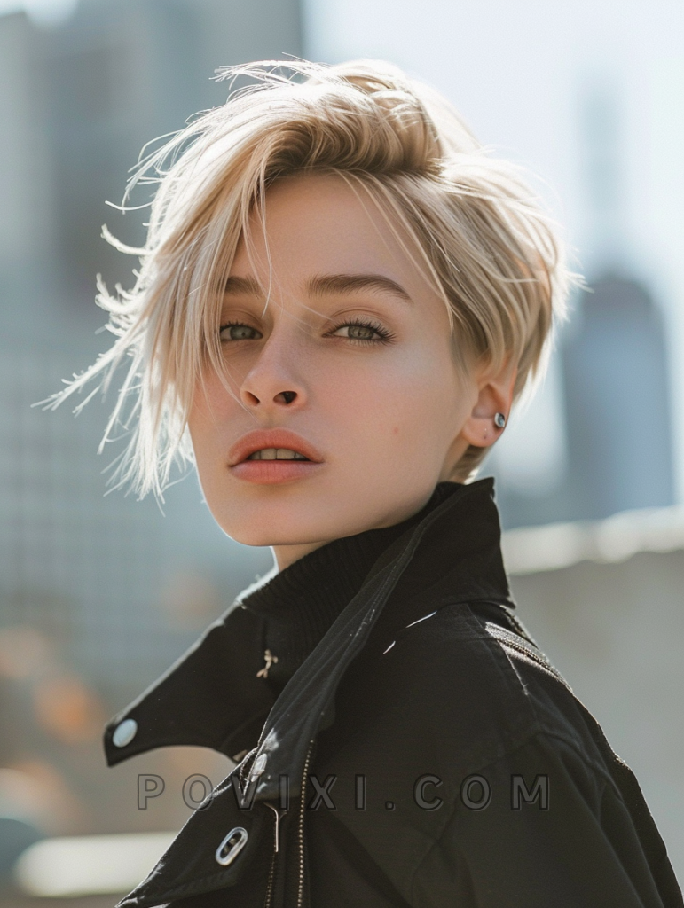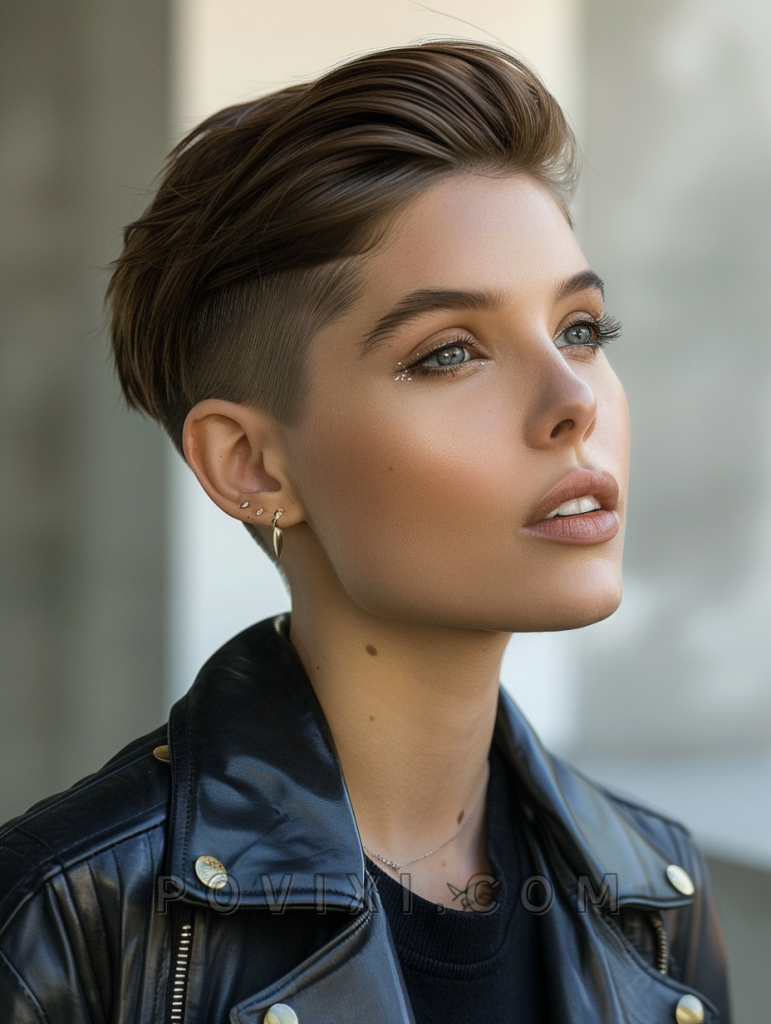 The side-swept crop offers a dynamic, asymmetrical look that’s both edgy and elegant. This short hairstyle works well on round and heart-shaped faces, making it a versatile choice for various occasions.