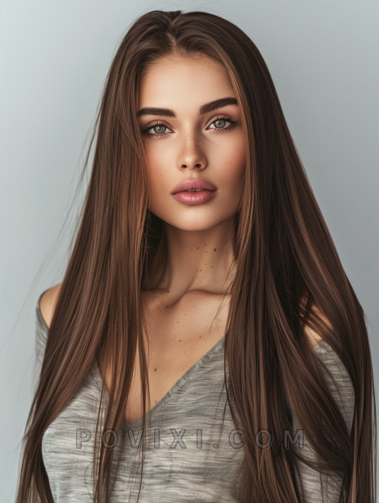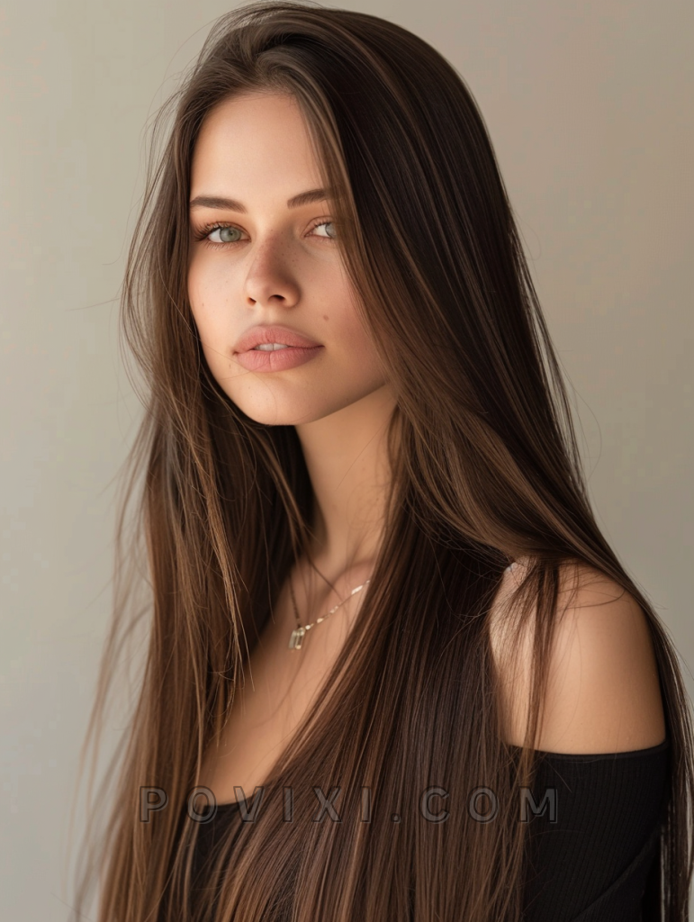 A long and sleek hairstyle exudes elegance and simplicity. This look is perfect for those with long, straight hair and complements all face shapes. It’s particularly striking for formal events or professional environments where a polished appearance is preferred.