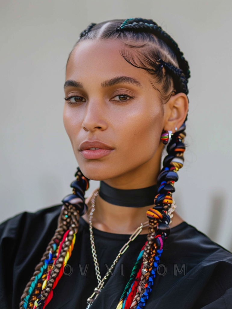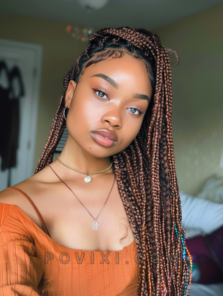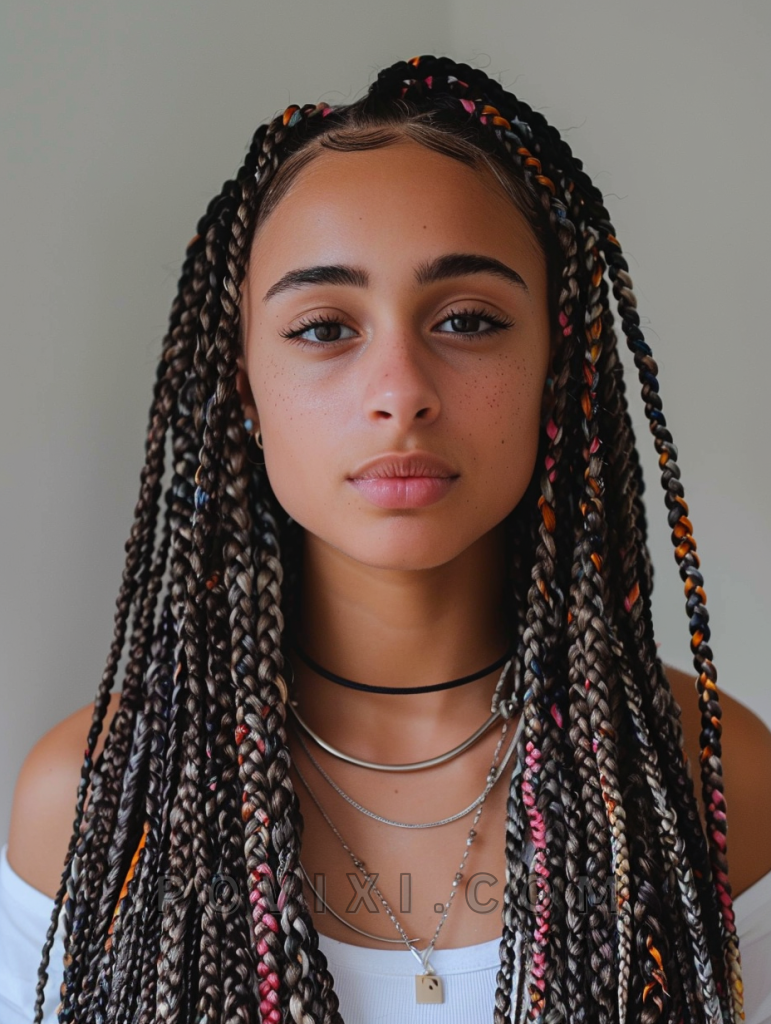 Box braids with color are a fun and vibrant twist on the classic box braids. This style involves adding colored hair extensions to the braids, creating a bold and eye-catching look. Box braids with color are perfect for any occasion and suit all face shapes. They are particularly great for those looking to make a fashion statement with their hairstyle.