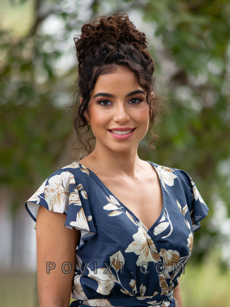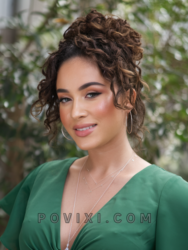 This natural hair look celebrates the beauty of latina curly textures in a chic and sophisticated bun.  Perfect for graduation, prom, or even a wedding, the bun is slightly loose, letting the curls frame the face and add dimension. It pairs wonderfully with hoop earrings and a glowing makeup look, suiting heart-shaped or round faces.