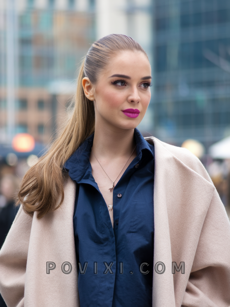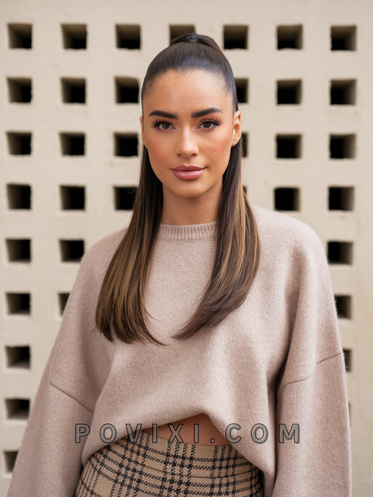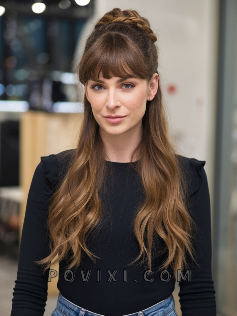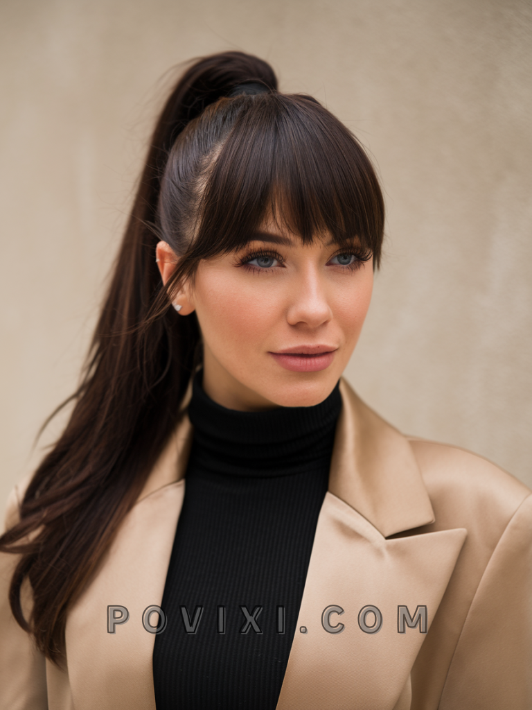 This hairstyle is the epitome of modern chic. The sleek ponytail is tied high, giving an illusion of lifted facial features, while the bangs frame the face, adding a soft, feminine touch. Ideal for a formal occasion, Valentine’s Day, or even a night out, this look works well on oval or diamond-shaped faces and complements bold eye makeup. Whether you have straight hair or use extensions, this style screams Insta-worthy glam.