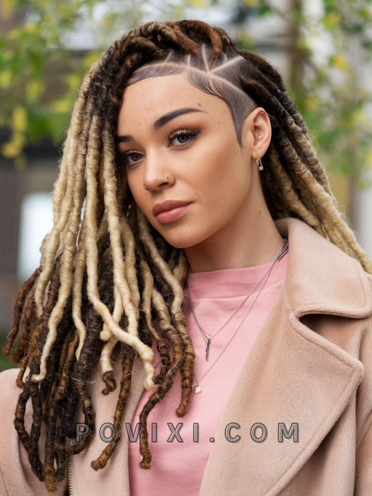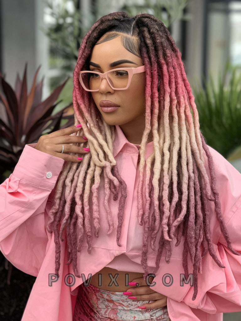 Locs with an ombre color effect are both stylish and low-maintenance, making them perfect for a work or school setting.  The gradual transition from dark roots to lighter ends creates a bold yet sophisticated look. This style suits all face shapes and complements black women with natural hair.