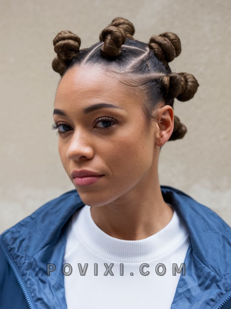 This stunning mix of a voluminous afro and intricate bantu knots creates a striking and unique look. Perfect for black women with natural hair, this style is bold enough for Halloween or a party but also works for casual outings. It highlights your hair’s texture while emphasizing cheekbones and jawlines.