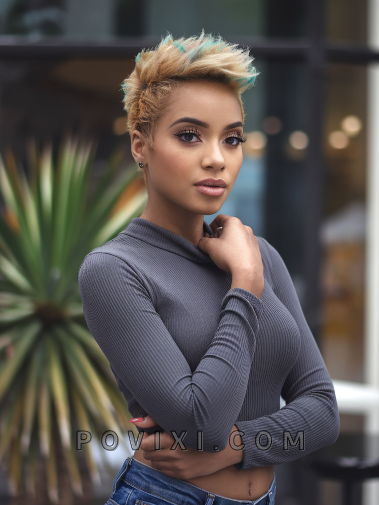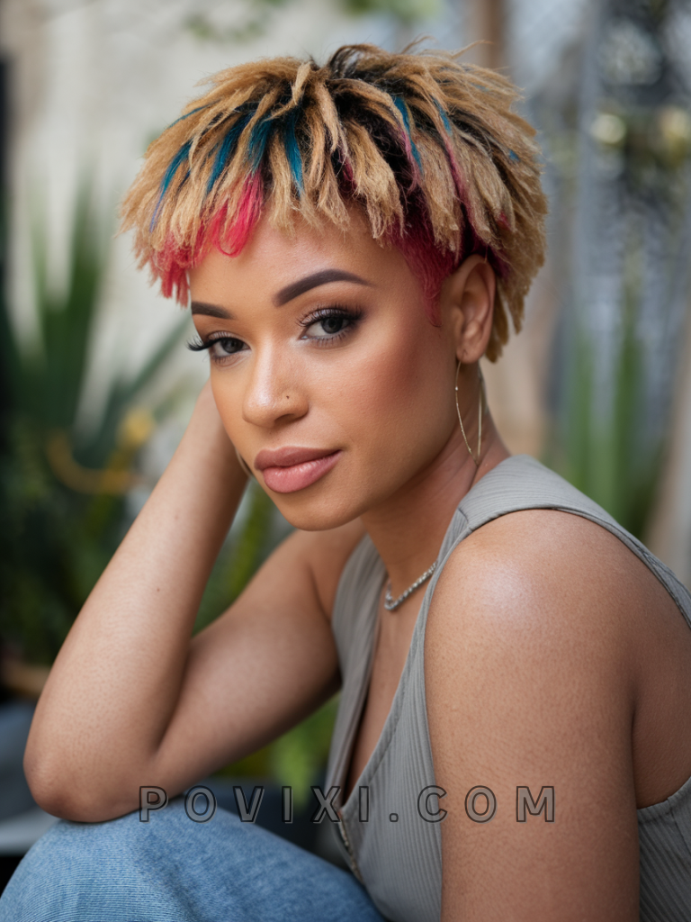 A short afro with vibrant colored tips is a bold choice for black women who love to stand out. Perfect for a casual party or birthday, this look combines natural texture with creative flair. It suits round and oval face shapes and works best with defined curls natural hair.
