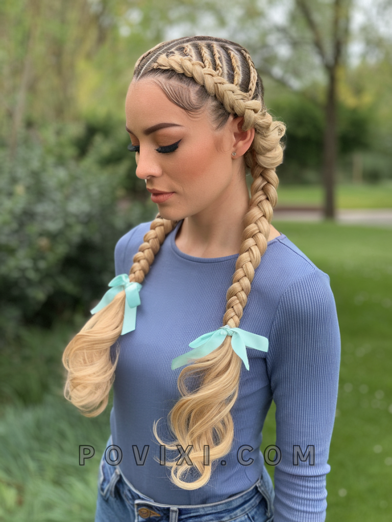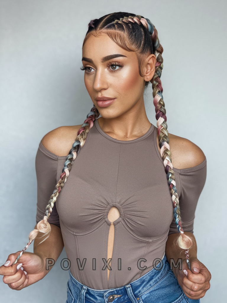 Begin by sectioning your hair into two parts and braiding each section using the Dutch braid technique. Incorporate extensions in contrasting colors for added flair. Secure the ends with clear elastics and finish with a light hold hairspray like L’Oréal Elnett Satin. For maintenance, wrap your hair in a satin scarf at night to prevent frizz.