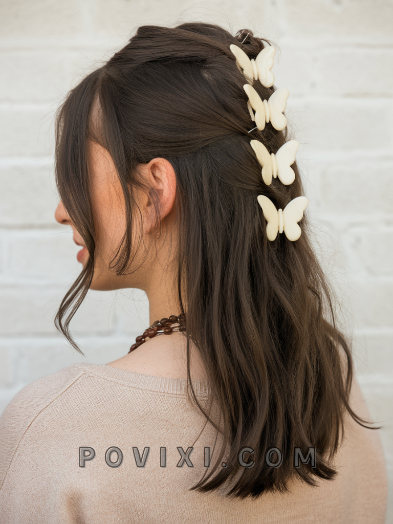 Butterfly clips bring a nostalgic 90s feel to a half-up hairstyle, making it perfect for casual outings or festivals. This look works well with medium length or long hair and enhances wavy or curly hair textures. Butterfly clips, especially in vibrant colors, add a playful, vintage touch that complements square and heart-shaped faces.