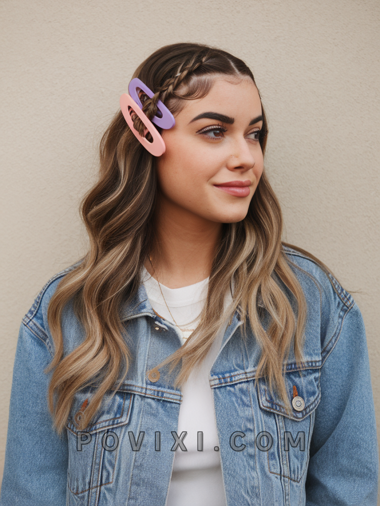 Part your hair on the side, braid a small section at the front, and secure it with a small clip or two in contrasting colors. Add another matching clip on the other side for symmetry. Maintain the style with a flexible-hold hairspray to keep the braid intact without stiffening the hair. A volumizing spray can add lift to the roots, giving it a classic 90’s vibe.