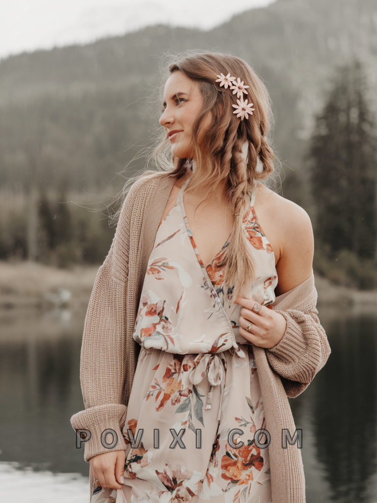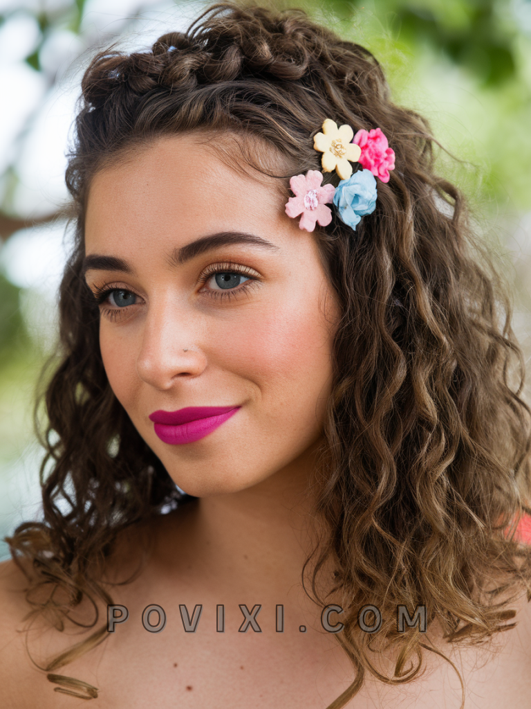 This half-up style adorned with delicate flower clips is a dream for bohemian lovers. Perfect for outdoor events, festivals, or even beach weddings, it has an earthy, free-spirited vibe that complements any relaxed, natural outfit. This style looks especially flattering on wavy or curly hair and brings out the vibrancy in warm eye colors like green and hazel. With the half-up style, medium length or long hair shines by offering a loose, voluminous effect.