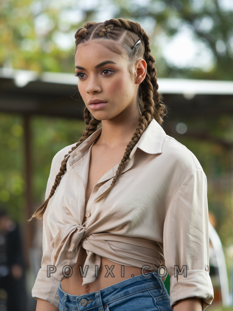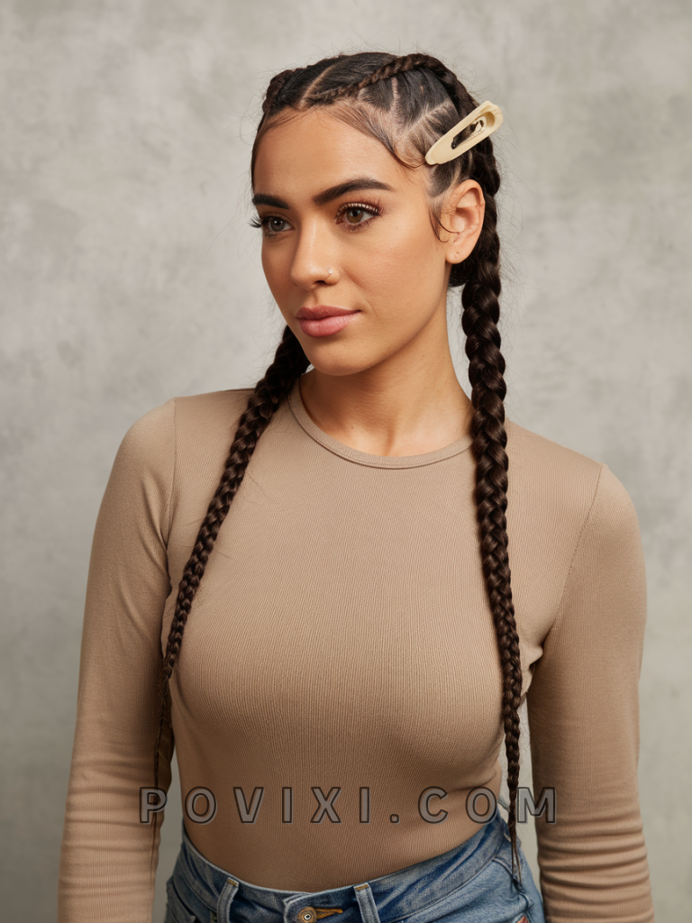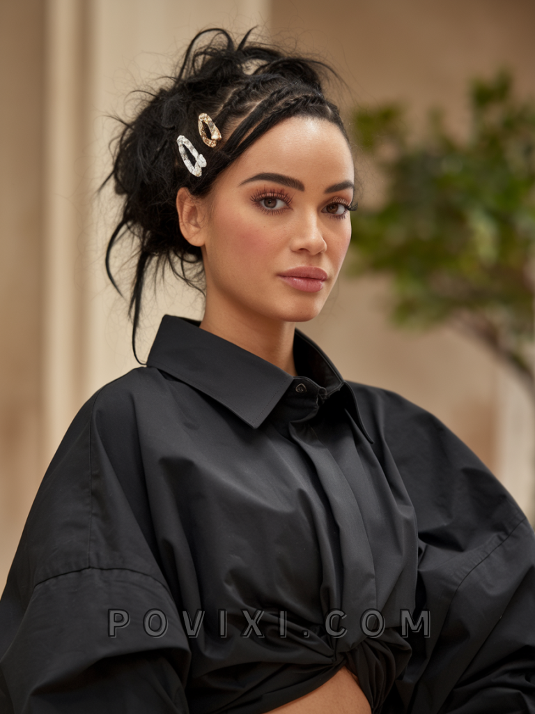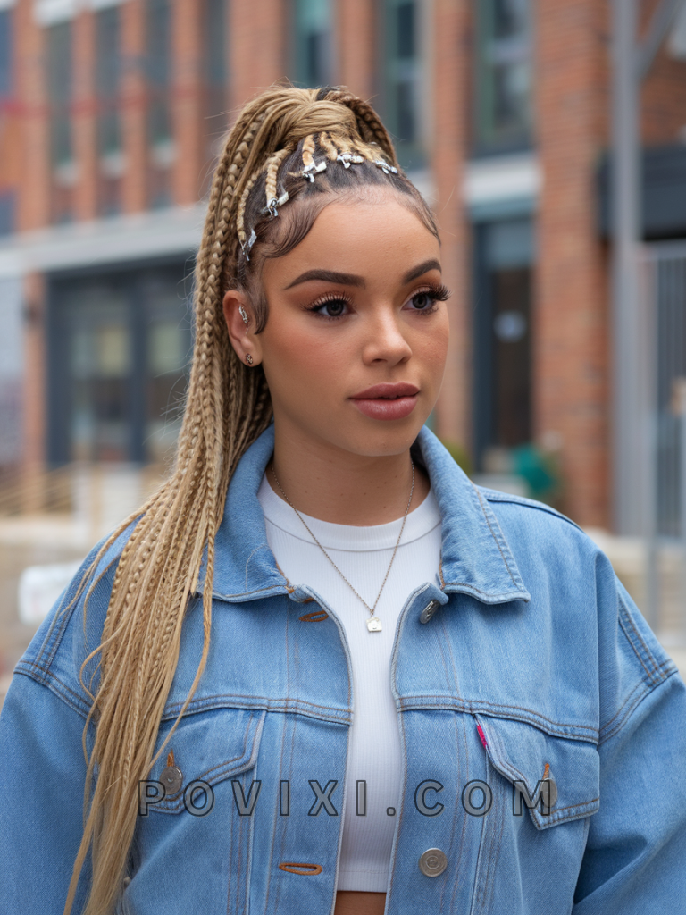 This high ponytail with braided extensions and metallic clips offers a bold, trendy look, perfect for parties or nights out. This style is ideal for long hair or those with hair extensions and works for any face shape, especially enhancing heart and diamond faces. The metallic clips bring an added level of sophistication to the high ponytail.
