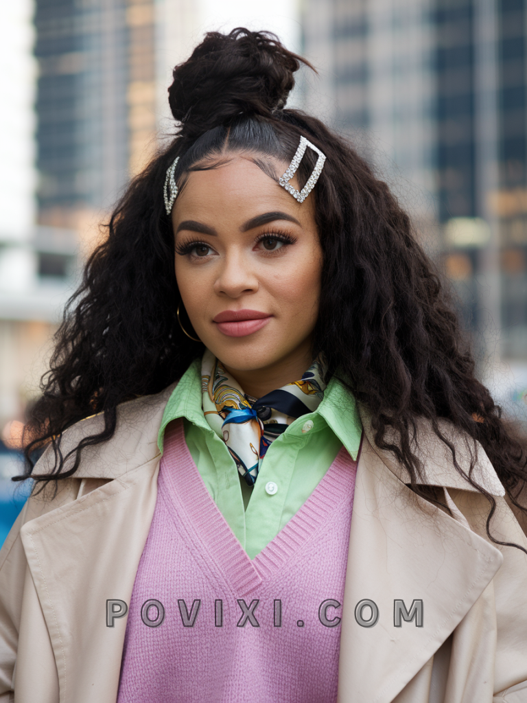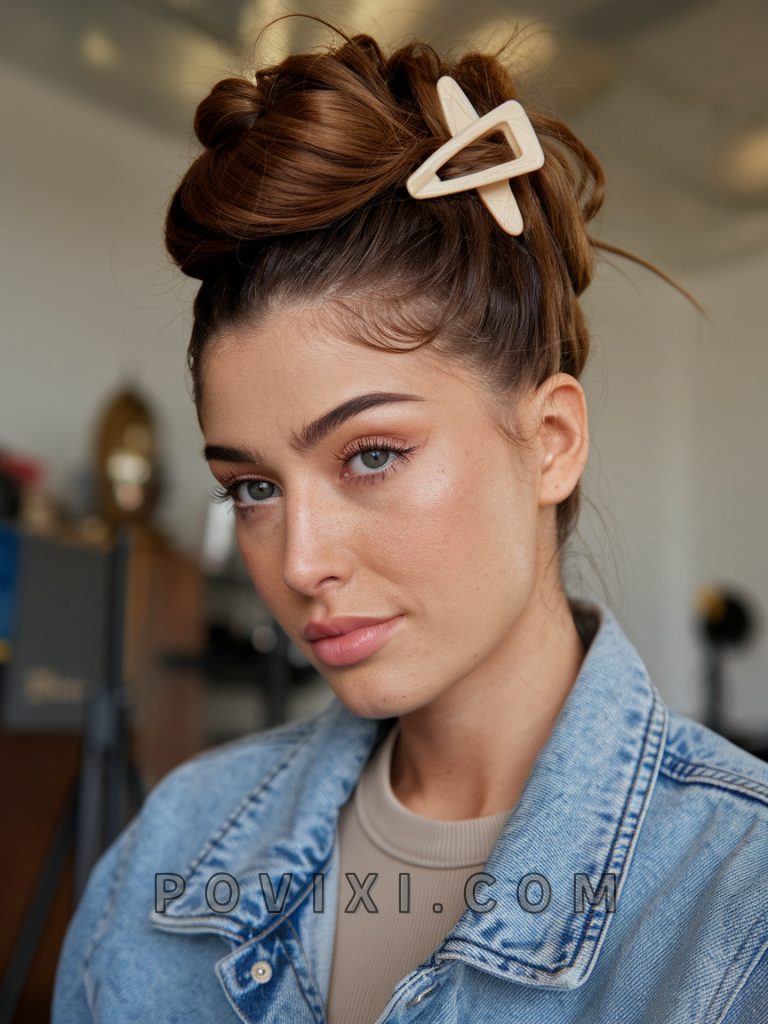 An oversized hair clip adds drama to a casual messy bun, making it ideal for brunch, school, or relaxed outings. This style suits medium length to long hair and flatters all face shapes, especially heart-shaped faces. The large clip adds a touch of boho or grunge style, depending on the clip’s color and design.