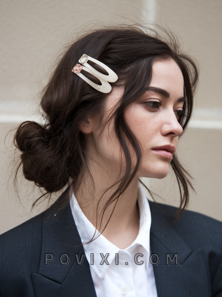 Twist hair loosely into a bun at the nape, securing it with an elastic and a few bobby pins. Slide a vintage clip into the side for an off-center, romantic touch. A light hairspray can help keep the messy look intact, while a leave-in conditioner adds softness and control.