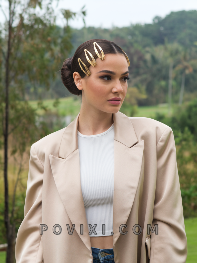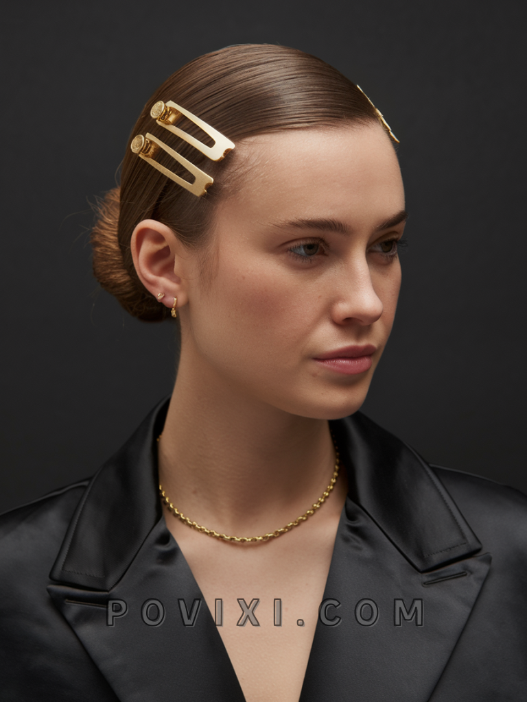 A slicked-back style using sleek gold clips is ideal for achieving a minimalist look with maximum impact. The style is perfect for formal occasions or when you want a bold, edgy look with minimal fuss. This style flatters short hair and chin-length bobs, making the face the focal point. It’s especially striking with bold makeup or jewelry, adding an air of sophistication that suits all face shapes and eye colors.
