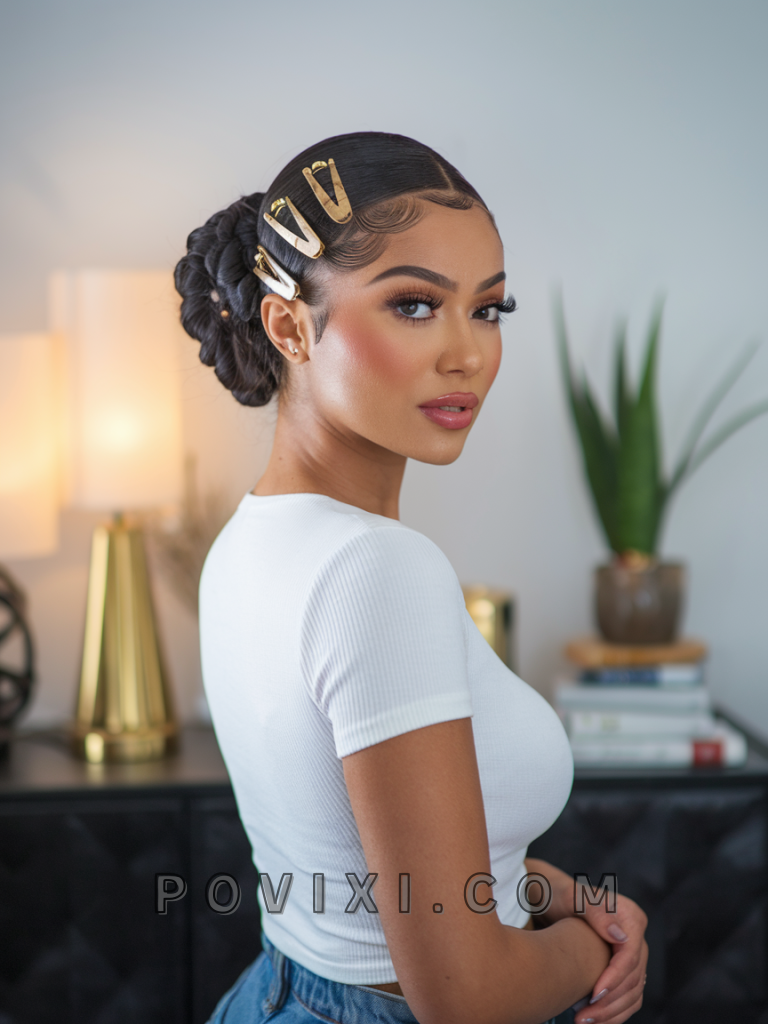 A sleek updo with gold clips exudes sophistication, perfect for formal events, work meetings, or a chic night out. This style is ideal for medium to long hair and works beautifully for oval and square faces. The gold clips add a touch of elegance and complement dark or warm hair colors.