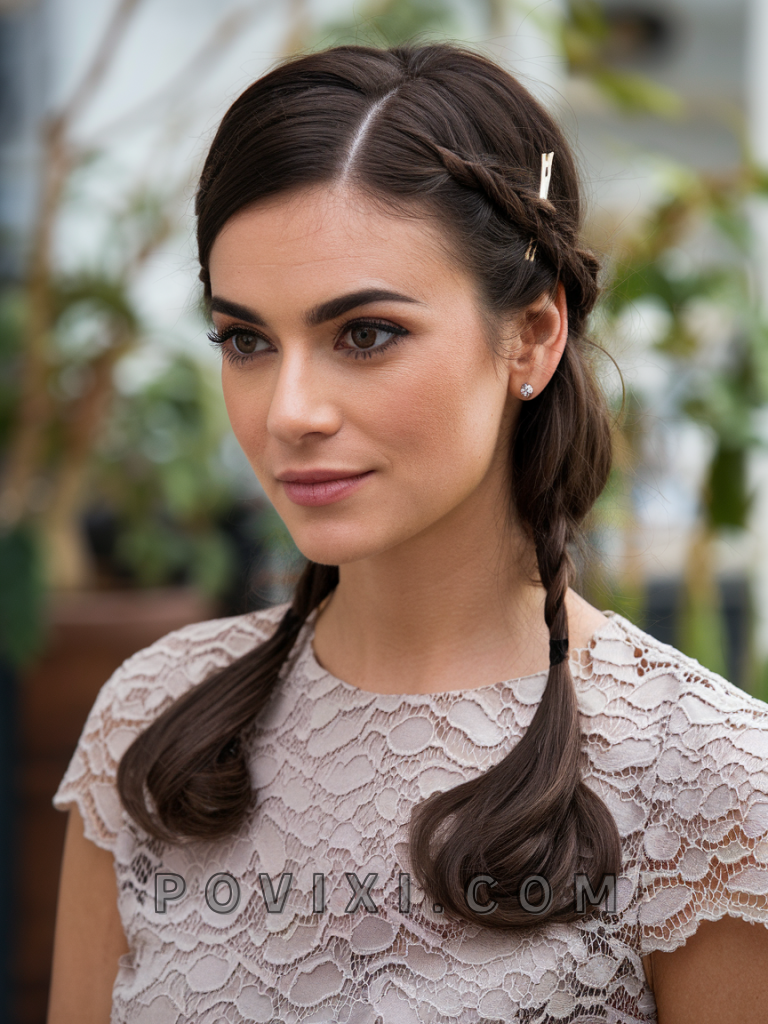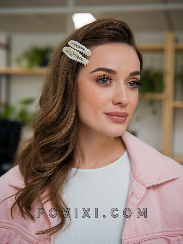 A pearl-adorned clip along a side part is the definition of modern elegance. This style gives any look a dash of vintage charm while keeping it trendy, making it ideal for weddings, date nights, or even formal work events. This clip style works best with medium hair or long hair that can hold the weight of a detailed clip, adding subtle shine to brown or black hair. For those with shoulder-length hair, the side part offers balance and enhances facial symmetry, especially if paired with a soft, natural makeup look.
