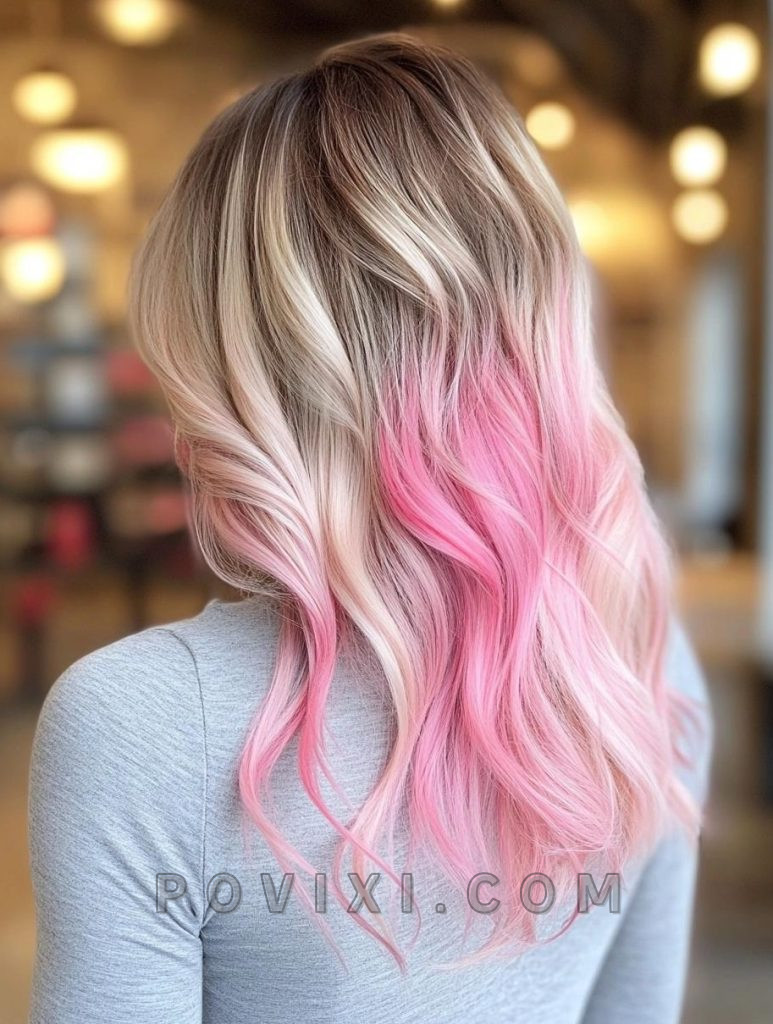 The bubblegum ombré with dark roots is a standout look that blends sweet pastel pink with a natural base, creating a striking contrast. This color is ideal for those who want to add a playful twist to their hairstyle without fully committing to a solid pastel shade. Perfect for a night out or a casual day, this style suits round or oval face shapes and pairs beautifully with blue or green eyes, making your look pop with its dreamy aesthetic.