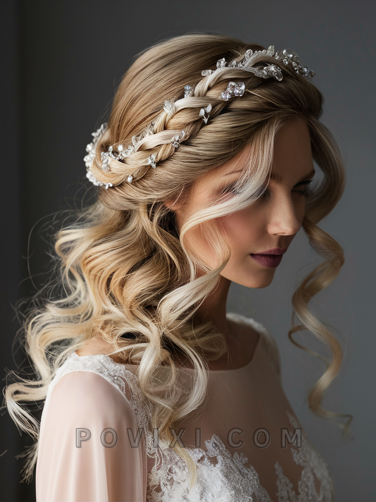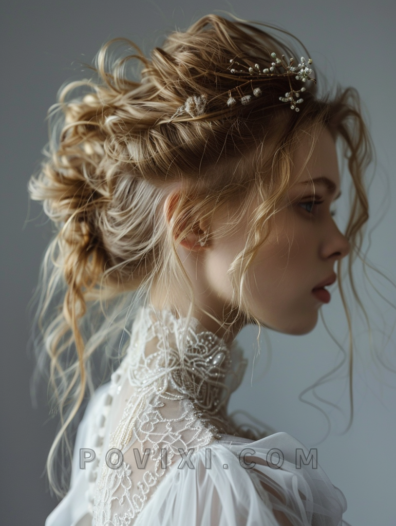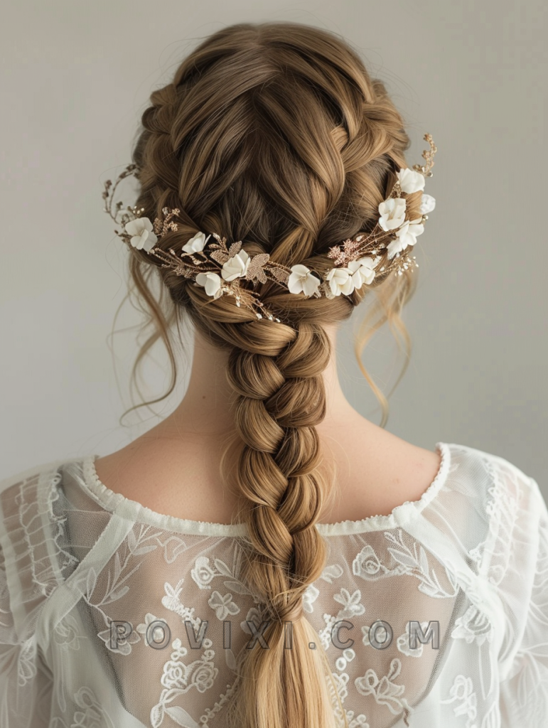 Create this ethereal style by twisting two thick strands from each side of the head and securing them into a crown-like braid at the back. Decorative floral or pearl pins can add a fairy-tale quality to the braid, while a light hairspray keeps everything in place.