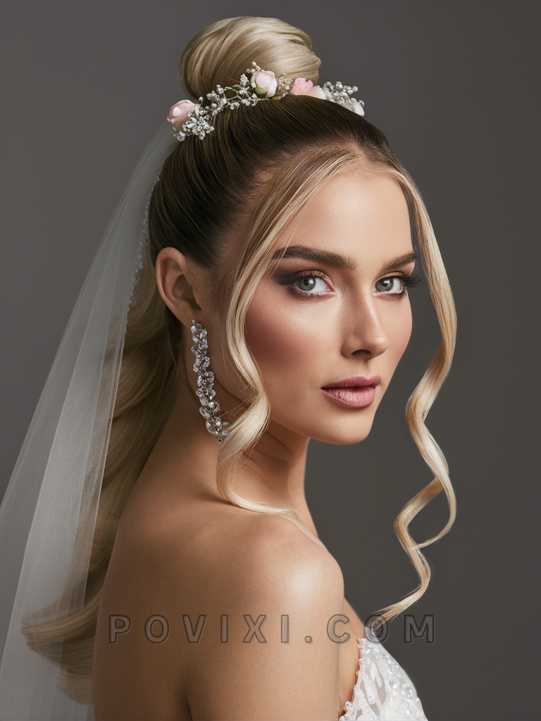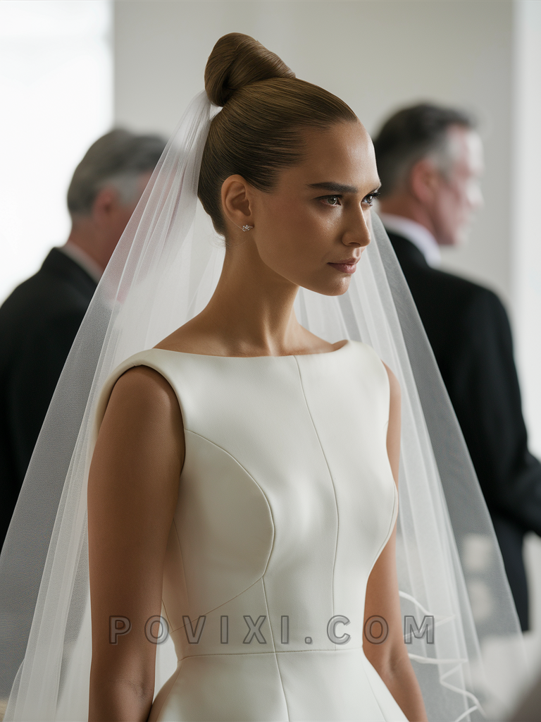 The Polished Top Knot is perfect for the minimalist bride with long hair. This style elevates the traditional bun by situating it at the crown of the head, making it ideal for those with round or heart-shaped faces.