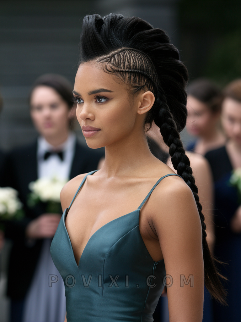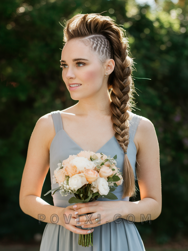 Lastly, the Modern Mohawk Braid is an edgy alternative for bridesmaids with long hair who dare to be different. This style suits heart and oval face shapes and is ideal for unconventional or modern-themed weddings.