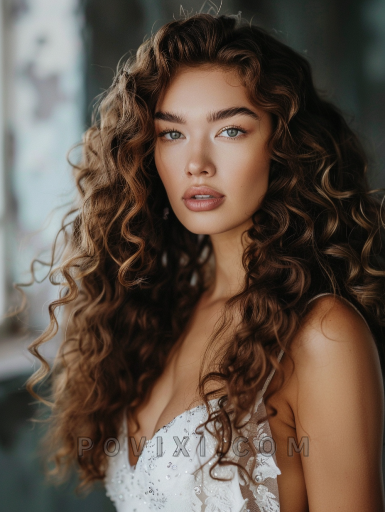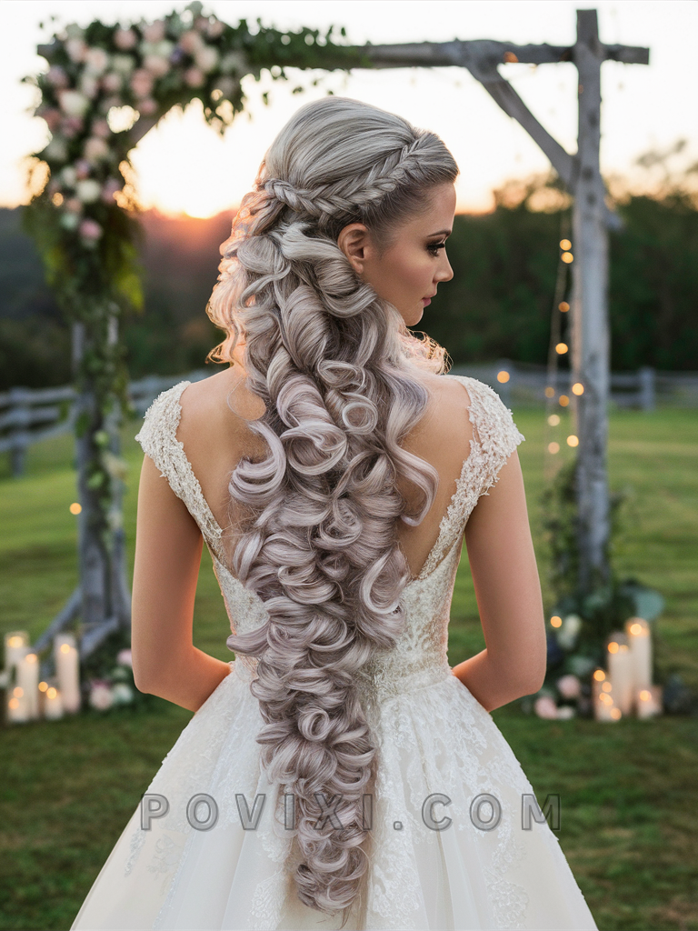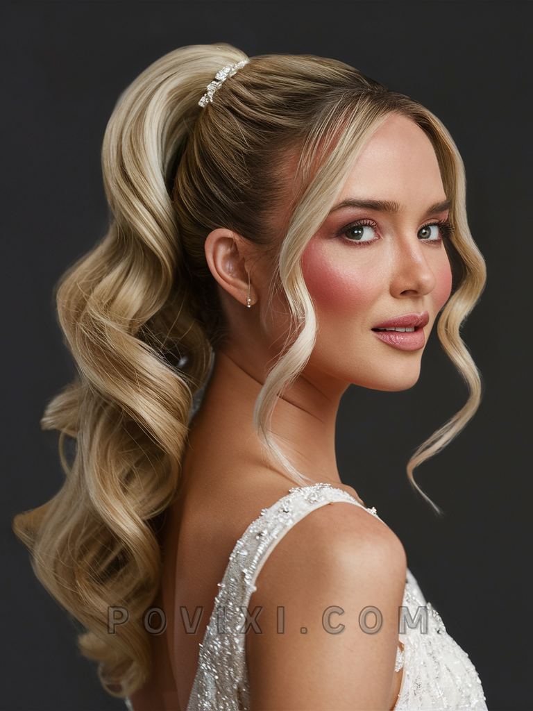 High Gloss Curls make a glamorous statement, suitable for brides or guests with long hair looking to dazzle at an evening wedding. This hairstyle enhances round and heart-shaped faces and pairs perfectly with elegant gowns.