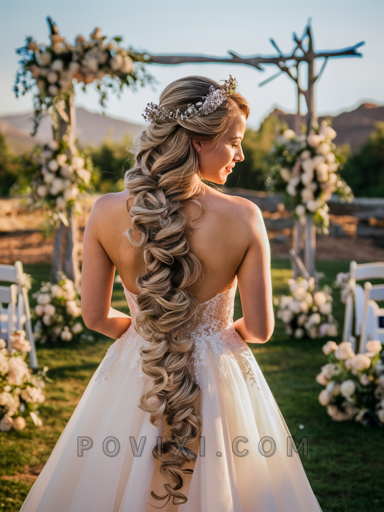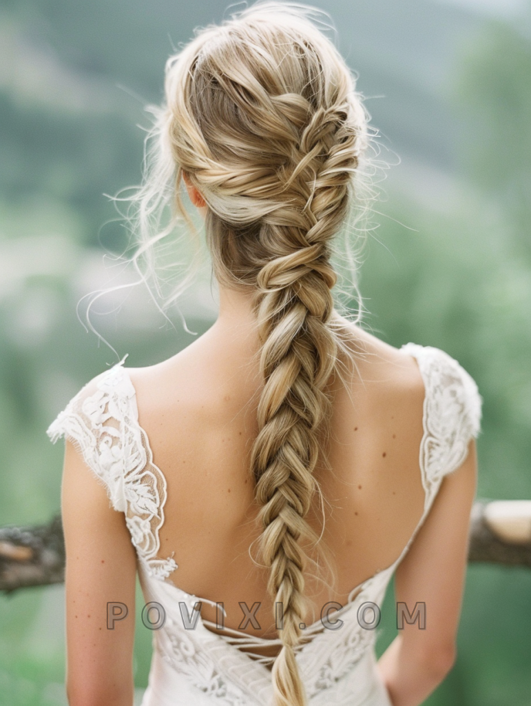 The Elegant Fishtail Braid is a stunning choice for a bohemian bride with long hair. This style is particularly flattering on longer face shapes and adds a whimsical touch to a laid-back wedding setting.