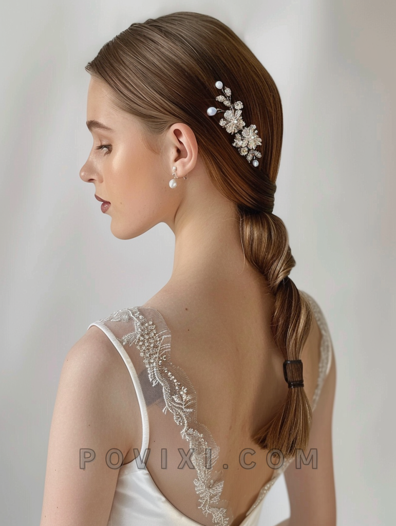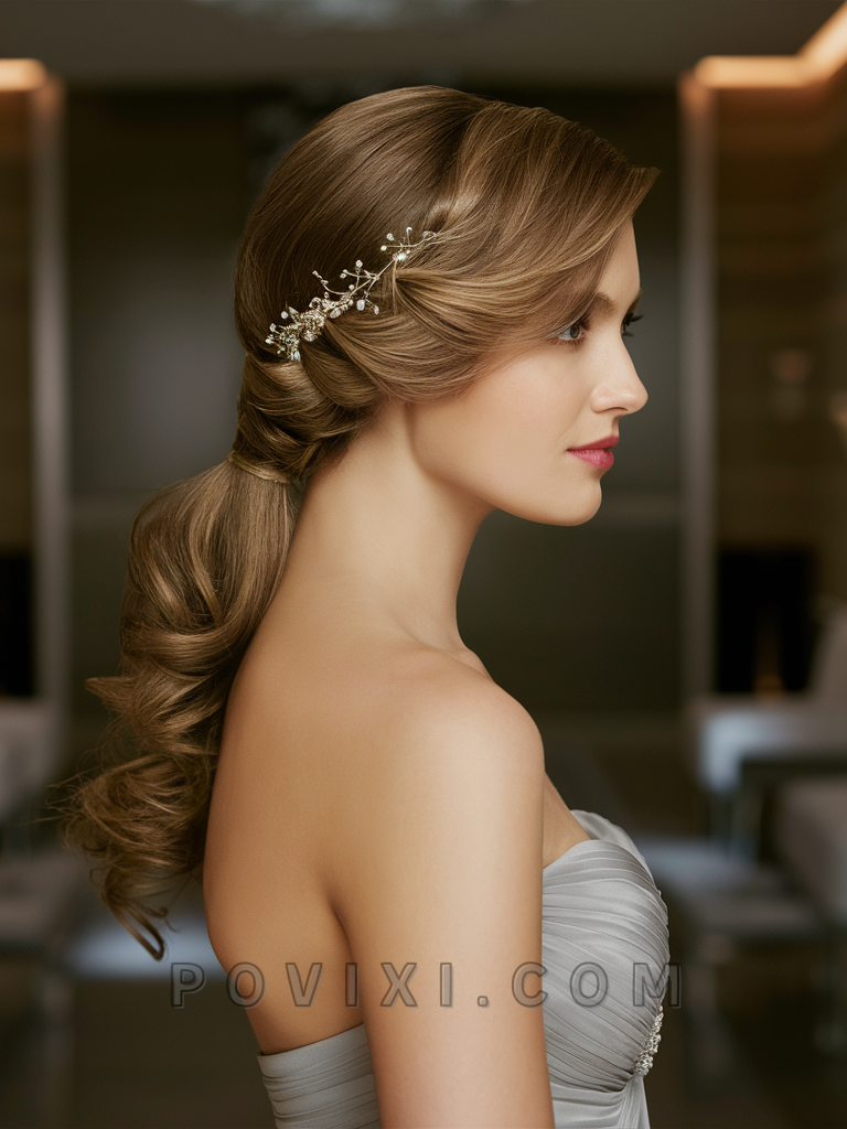 Finally, the Sleek Side-Swept Ponytail offers a clean and sophisticated option for bridesmaids or guests with long hair. This hairstyle is particularly flattering for those with oval or long face shapes and works well in both formal and semi-formal wedding settings.