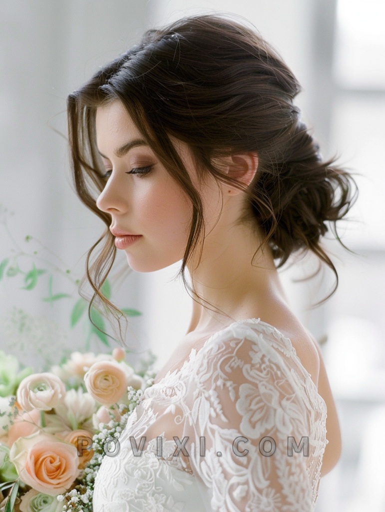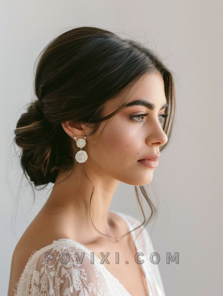 The Classic Low Chignon remains a timeless choice for the bride seeking simplicity and sophistication. This style is perfect for those with medium to long hair and complements any face shape, especially enhancing those with angular features.