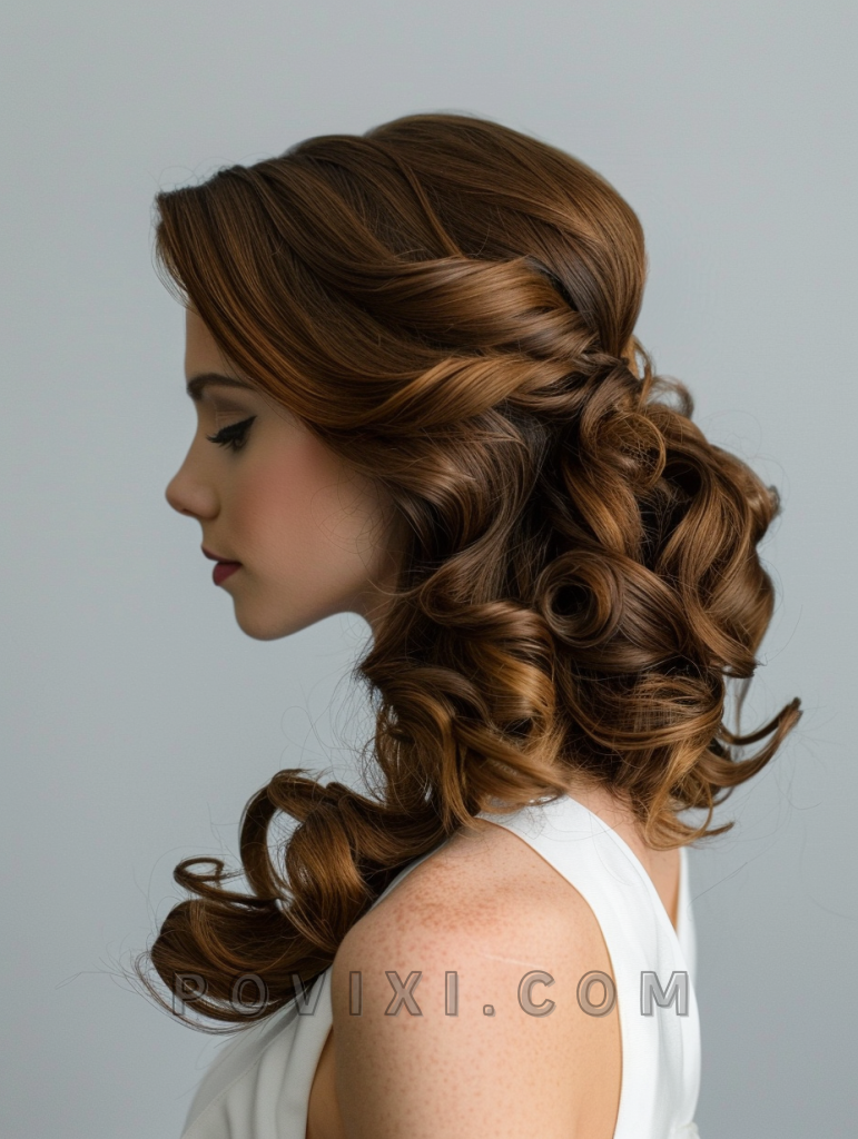 Elegant Side Swept Curls offer a glamorous look for wedding guests and bridesmaids with long hair. This hairstyle pairs well with elegant and formal wedding themes, flattering wider face shapes and enhancing any eye color.