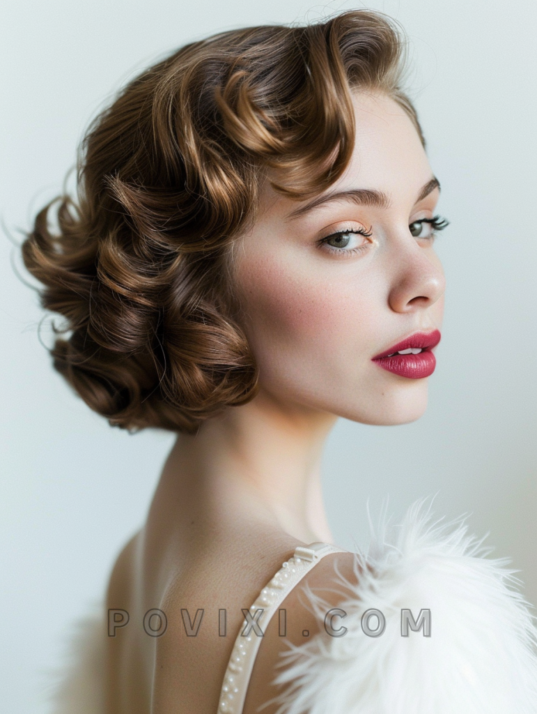 Use a large-barrel curling iron to create soft, flowing waves. Brush through the curls gently to form smooth, continuous waves, and set with a flexible-hold hairspray to retain the shape without stiffening the hair. Adding a decorative hairpiece or a vintage clip can complete the glamorous 1920s or 1940s look.