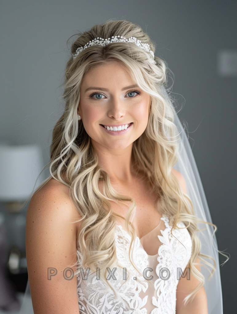 The Tousled Half-Up Half-Down look is ideal for a relaxed yet stylish wedding atmosphere, great for long hair and all face shapes. This style is particularly appealing for outdoor or beach weddings, giving a free-spirited vibe.