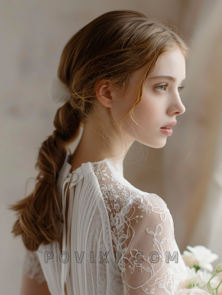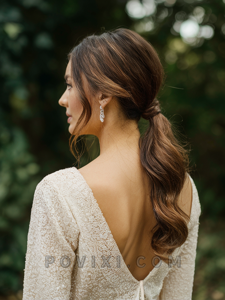 The Soft Low Ponytail blends simplicity with romance, ideal for the graceful bride with long hair. This understated style highlights the delicate features of oval and almond-shaped faces and suits any serene and elegant wedding setting.